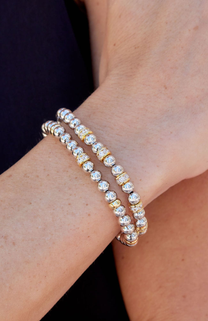 Made with 18K gold plated over bronze stretch beads. Features 6mm beads and white CZ stones. Stretch design for a perfect fit.