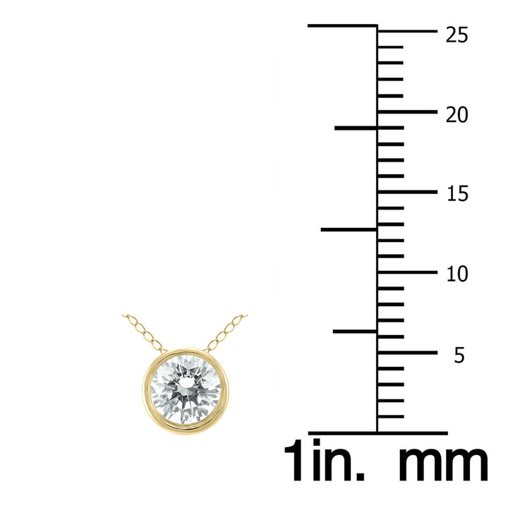 Crafted in 14K yellow gold. 1 round-cut diamond (0.30 cttw), clarity I2-I3, color J-K, Very Good cut. Bezel setting. Pendant measures approximately 0.25' in diameter. 18' chain with spring ring clasp. Average gram weight: 1.5g.