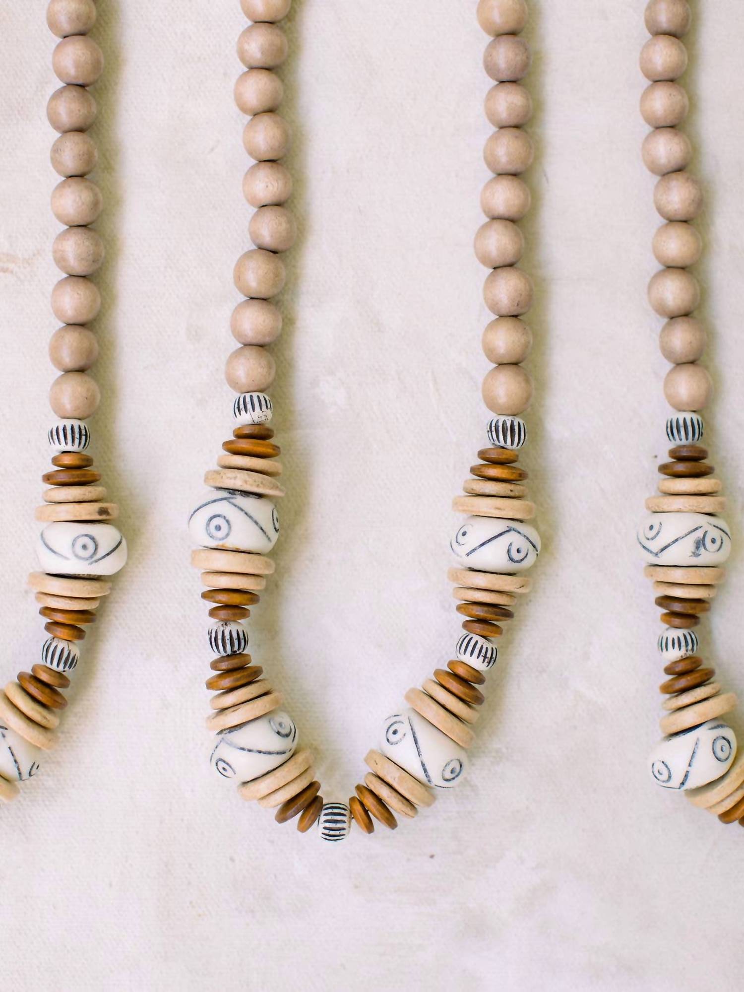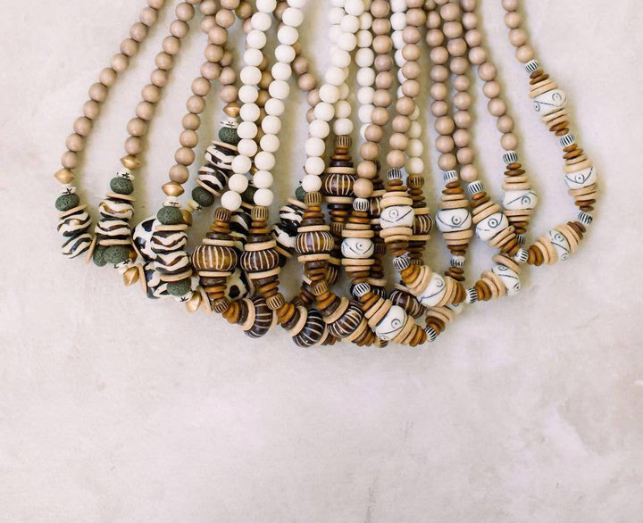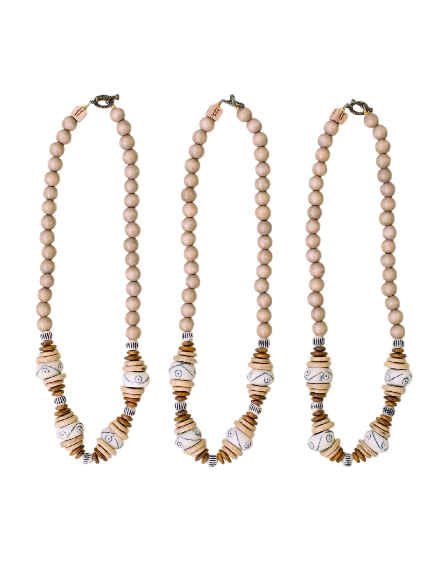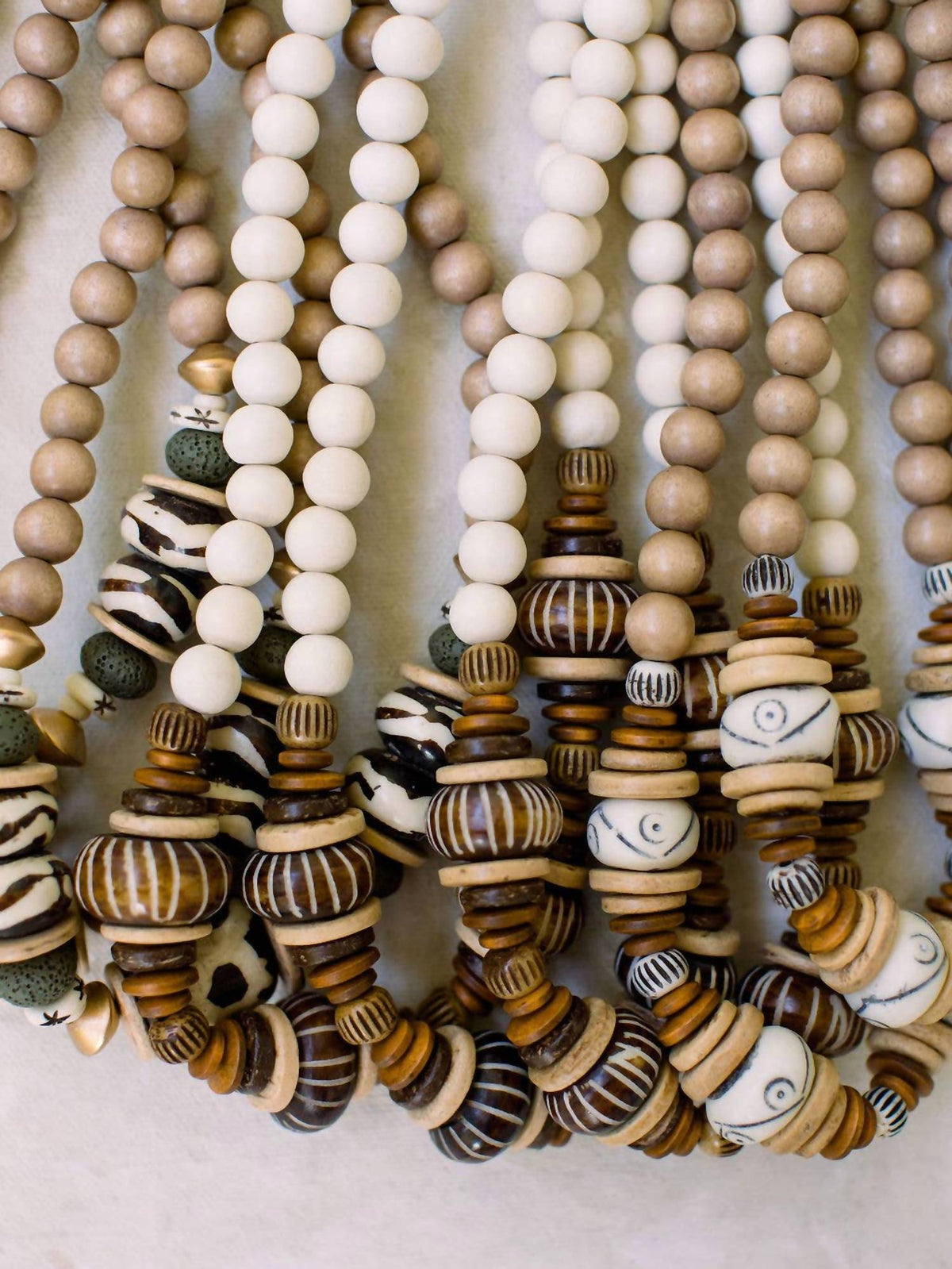 This The Sloane Wood Beaded Necklace in Tan by CAROLINA STRUNG combines tan wood beads with white bone beads for a natural, earthy aesthetic. This necklace offers a timeless and sophisticated look, making it a versatile addition to any jewelry collection.