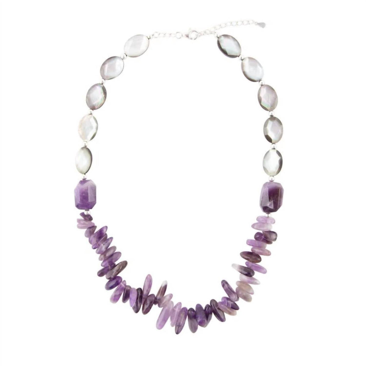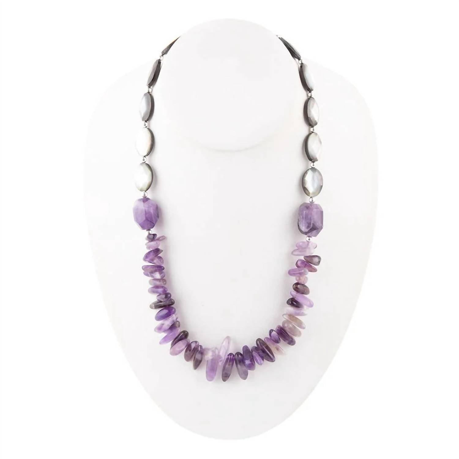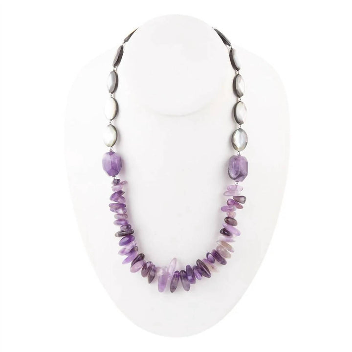 This Women's Amethyst Love Necklace in Purple by Barse showcases the deep purple tones of amethyst combined with abalone, creating a bold and vibrant piece. It’s hand-finished and secured with a lobster clasp for durability.