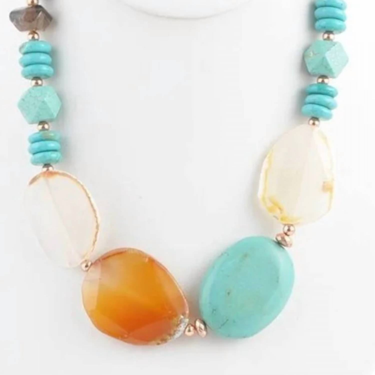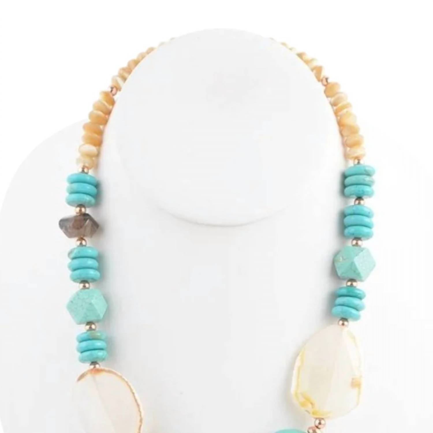 This Women's My Tribe Necklace in Turquoise by Barse is an eclectic and vibrant piece featuring mother of pearl faceted beads, turquoise magnesite, and copper elements. The necklace is handcrafted for a one-of-a-kind look, with an adjustable length for the perfect fit.
