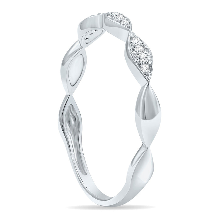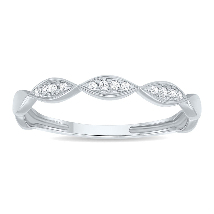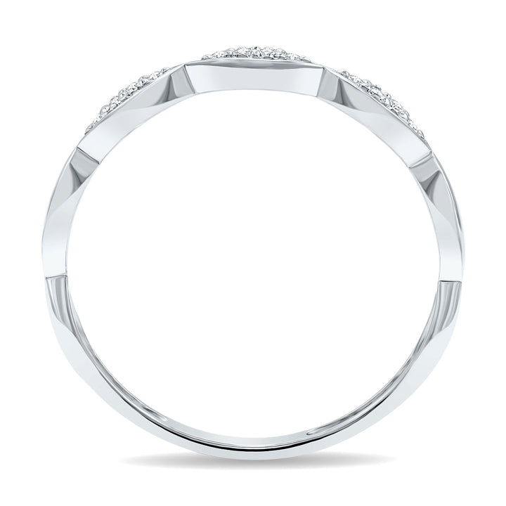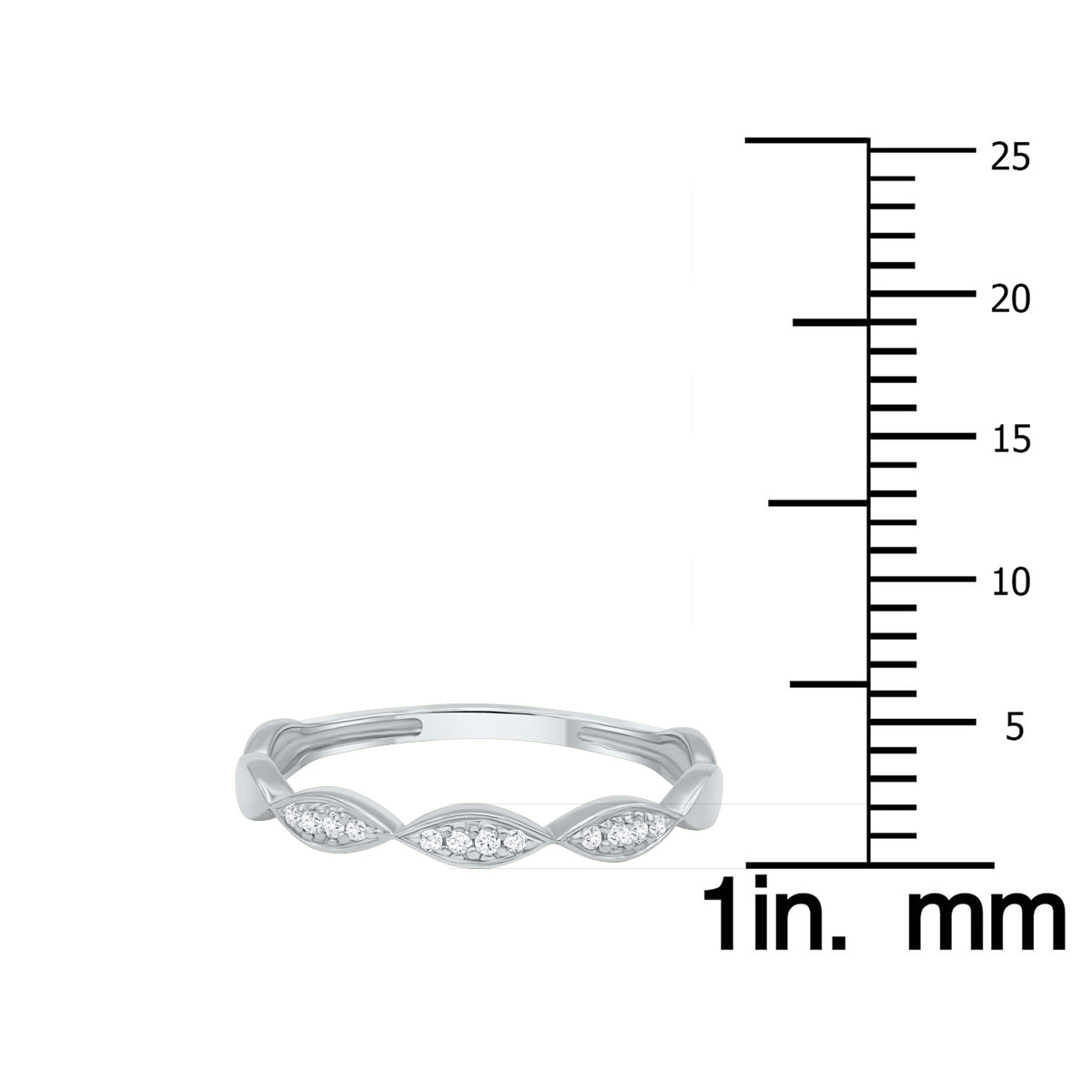 Crafted in 10k white gold. Set with 12 natural round diamonds totaling 0.05 carats (J–K color, I2–I3 clarity). Band width: 1mm.