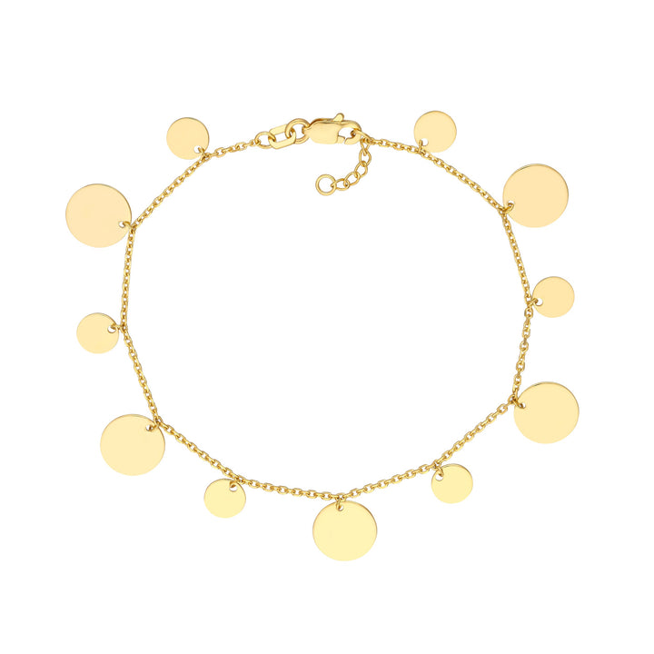 This 14k Solid Yellow Gold Multi Bracelet by SSELECTS combines elegant simplicity with a modern edge. The bracelet features alternating-size discs, creating a visually interesting design that's perfect for both day and night. Crafted from non-tarnishing 14k yellow gold, this bracelet will remain radiant and fresh for years to come. The adjustable lobster claw clasp ensures a secure fit.