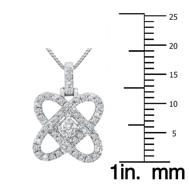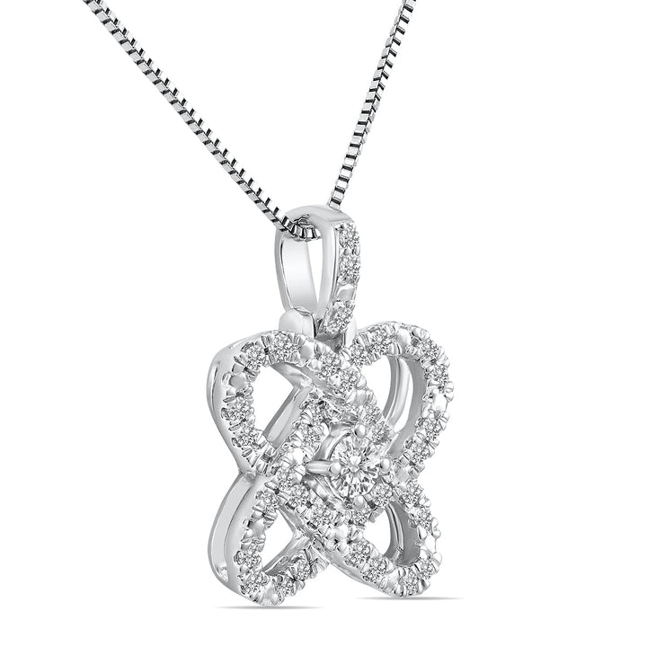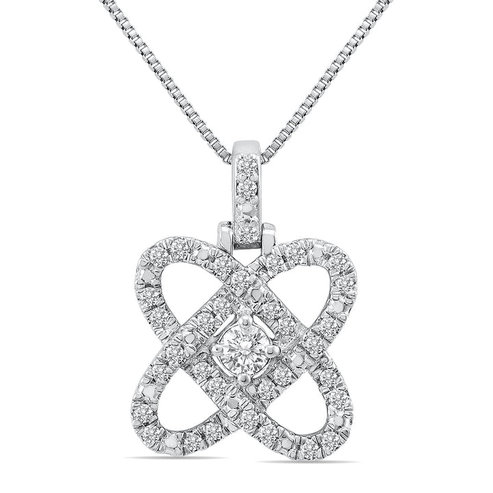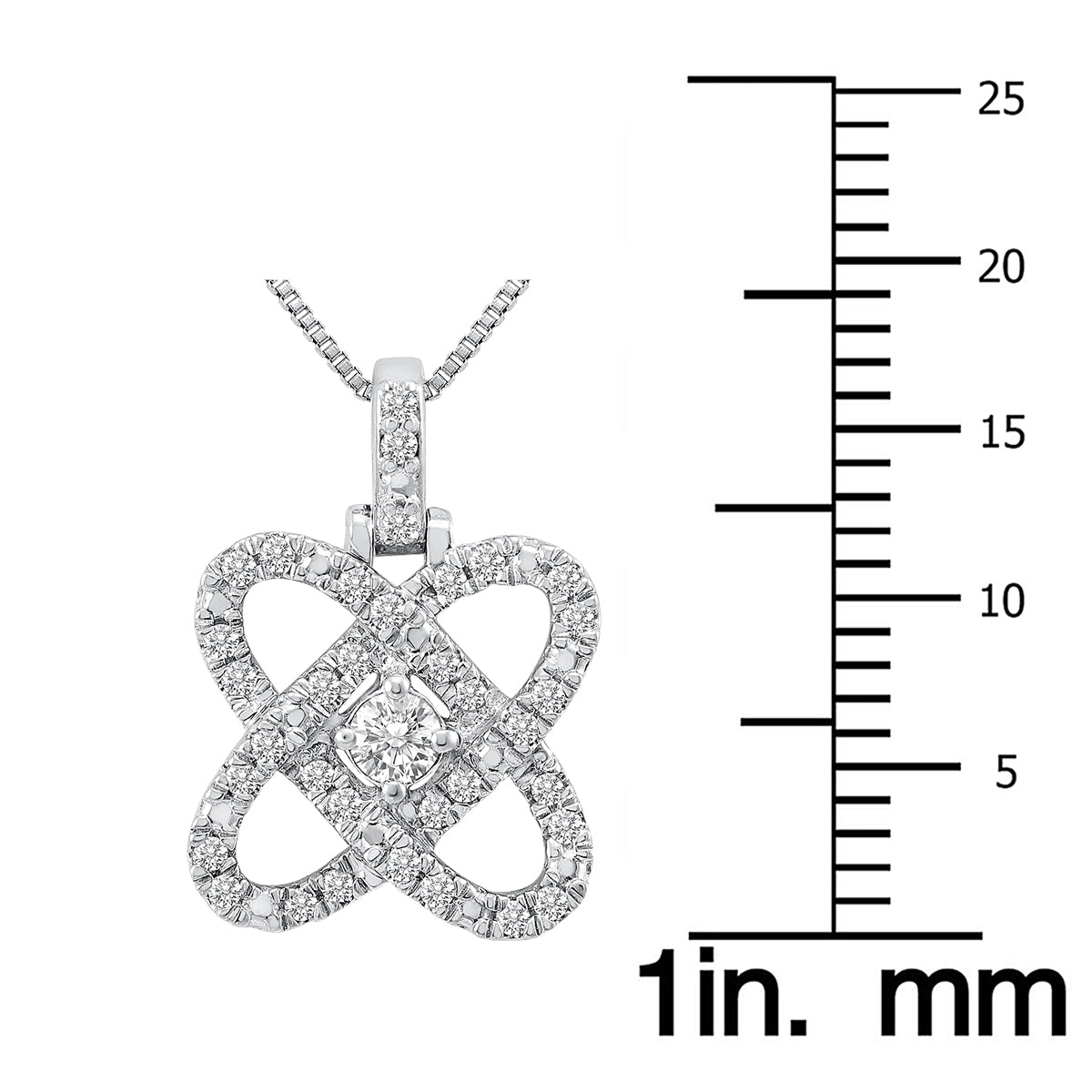 Crafted in .925 sterling silver with 36 round brilliant diamonds (0.25 carat total weight), I2-I3 clarity, J-K color. Necklace length: 18 inches. Infinity pendant design.