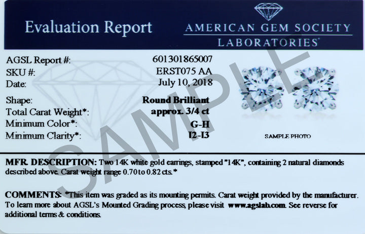 These 3/4 Carat TW AGS Certified Round Diamond Solitaire Stud Earrings in 14K White Gold by SSELECTS are designed to impress. Featuring AGS-certified diamonds, these earrings are a symbol of timeless luxury and will add brilliance to any outfit.