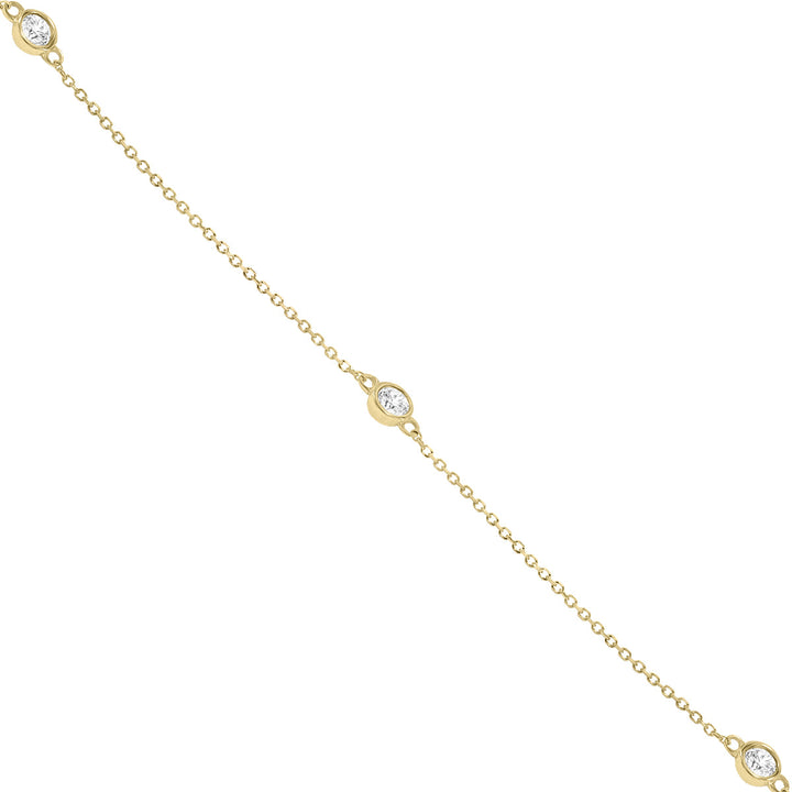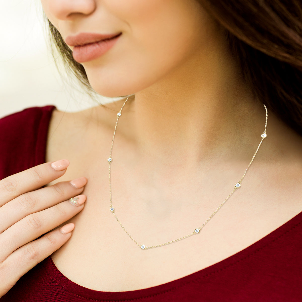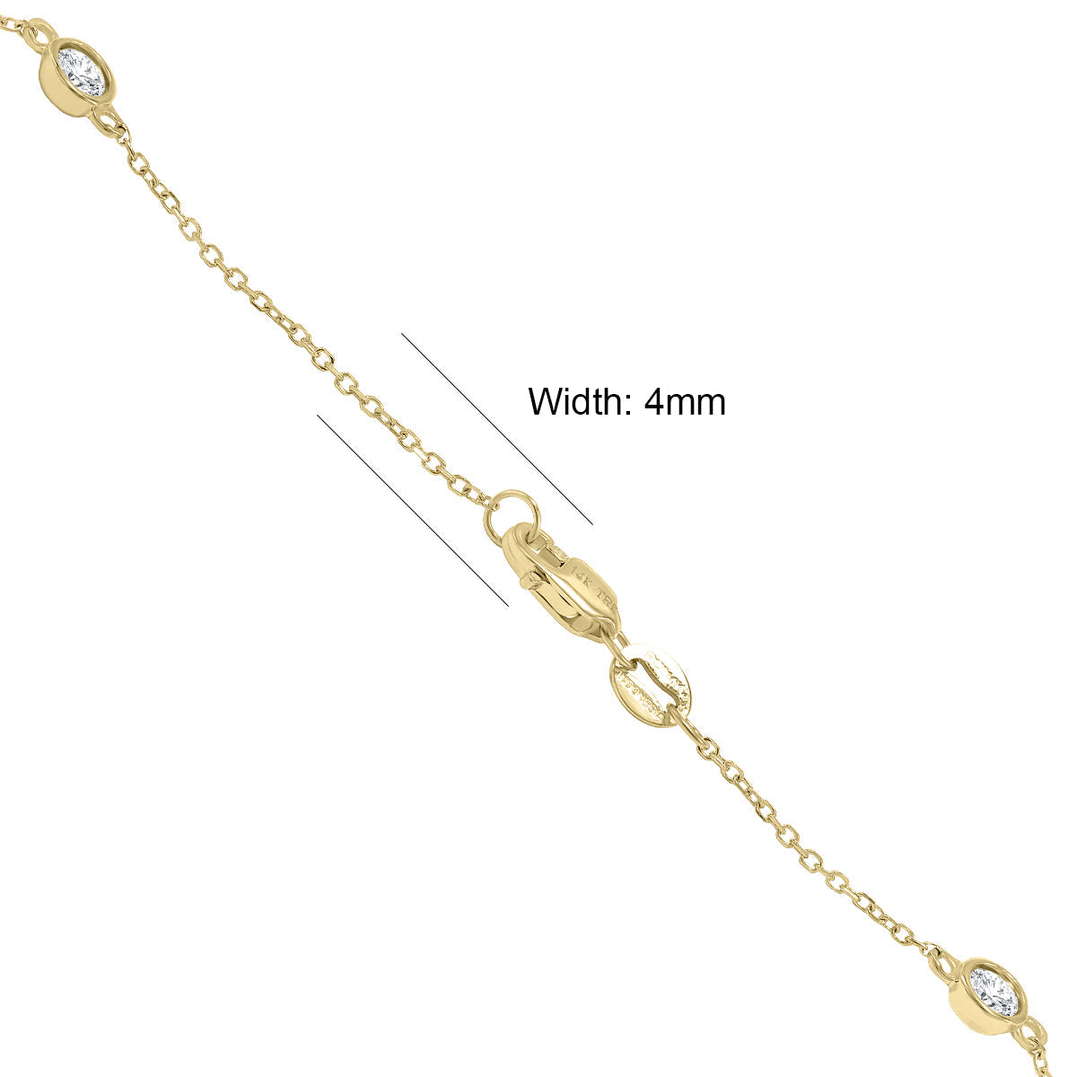 This 1 Carat TW Bezel Set Diamond Station Necklace in 14K Yellow Gold by SSELECTS is a popular and stylish piece, featuring 10 genuine bezel-set diamonds with a total weight of 1 carat. The 0.80mm gauge cable chain provides a dainty yet cool look, making this necklace perfect for everyday wear or special occasions. The necklace measures 18 inches in length and is secured with a durable lobster claw clasp.