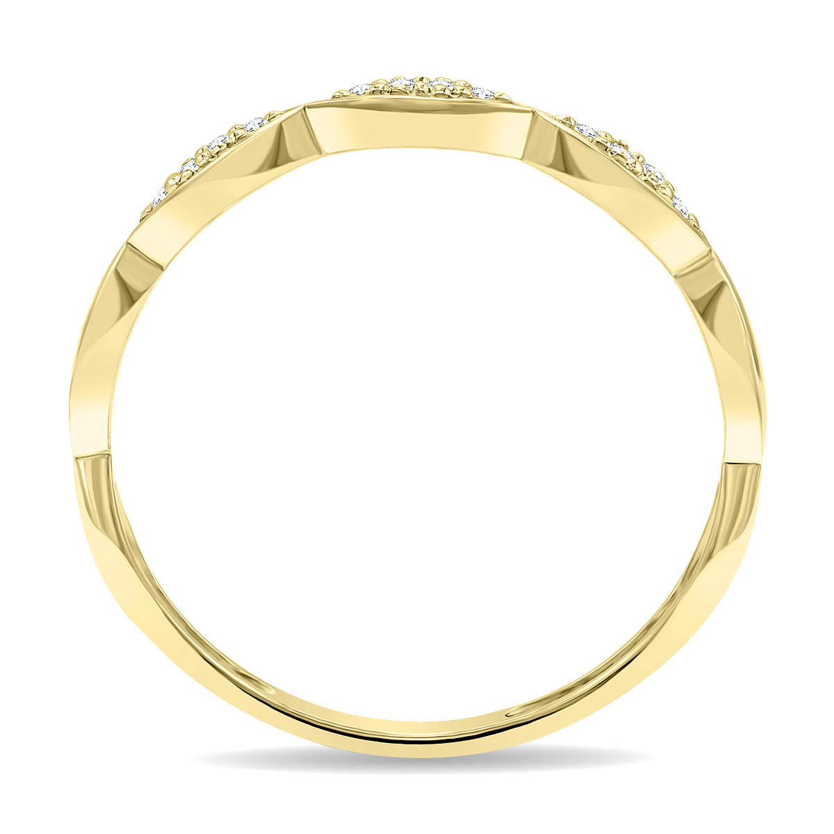 Crafted in 10k yellow gold. Set with 12 natural round diamonds totaling 0.05 carats (J–K color, I2–I3 clarity). Band width: 1mm.
