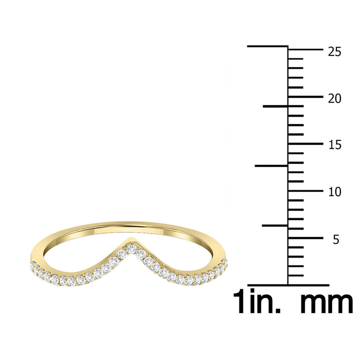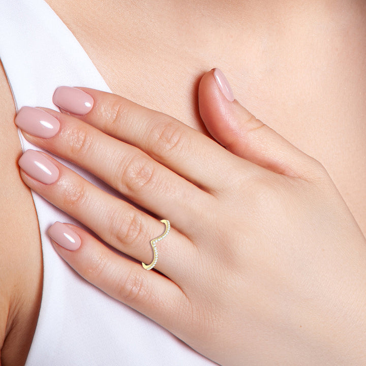 This 1/8 Carat TW Diamond V Ring by SSELECTS adds a warm golden glow to its modern V silhouette. Made in 14K yellow gold, the chevron-shaped band is studded with 27 glittering round diamonds that catch the light with every movement. A dainty yet stylish design perfect for stacking or wearing as a unique standalone piece.
