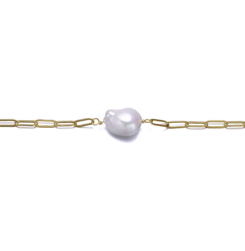Crafted in sterling silver, 14k gold plating, and featuring a white freshwater pearl. Paperclip chain design with lobster clasp closure.
