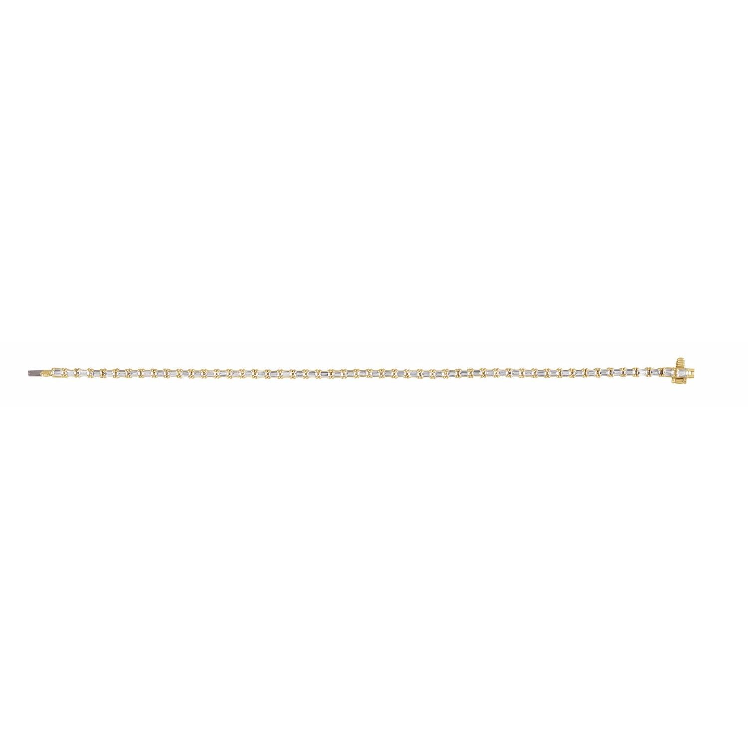 This 14k Gold 5 Ctw Lab-Grown Diamond Line Bracelet by Diamond2Deal is a sustainable and luxurious piece, featuring 5 carats of lab-grown diamonds. Crafted in 14K yellow gold, this bracelet is perfect for both daily wear and special occasions. The diamonds are set in a line, providing a consistent sparkle and elegance, secured with a box clasp.