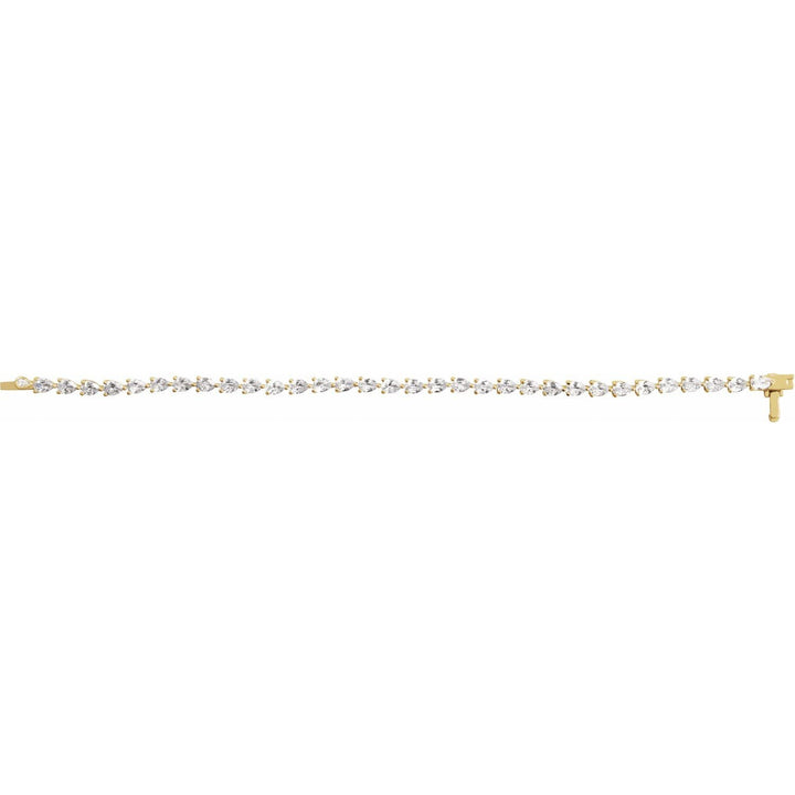14k yellow gold with 6.5 carats of lab-grown diamonds (G-H color, SI clarity). Box clasp closure. Length: 7 inches. Metal weight: 9.46 grams.