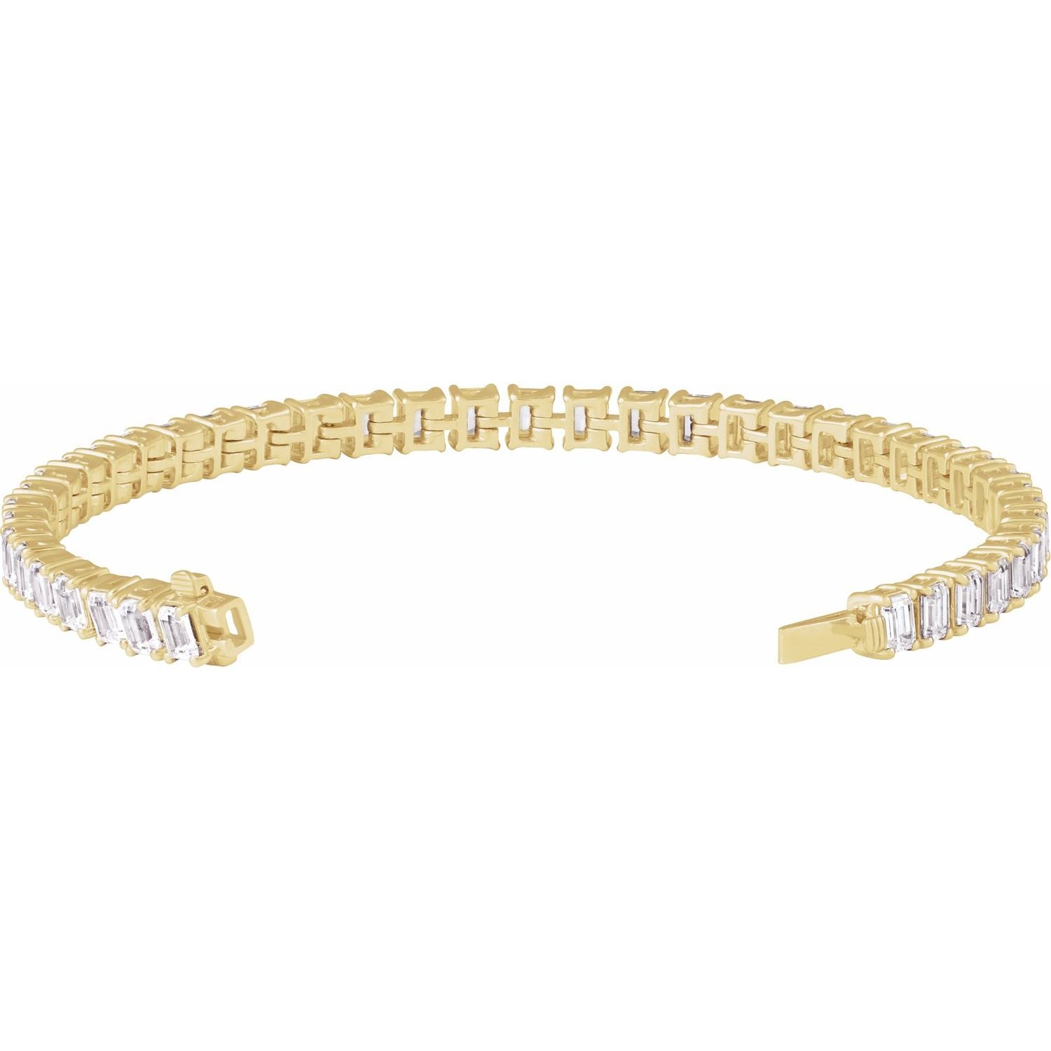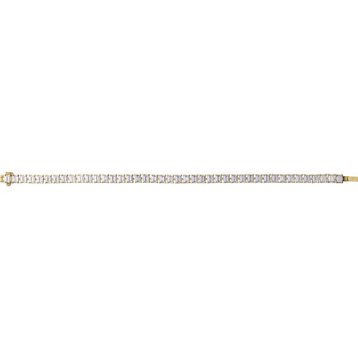 14k yellow gold with 10.5 carats of lab-grown diamonds (G-H color, SI clarity). Box clasp closure. Length: 7 inches. Metal weight: 14.7 grams.