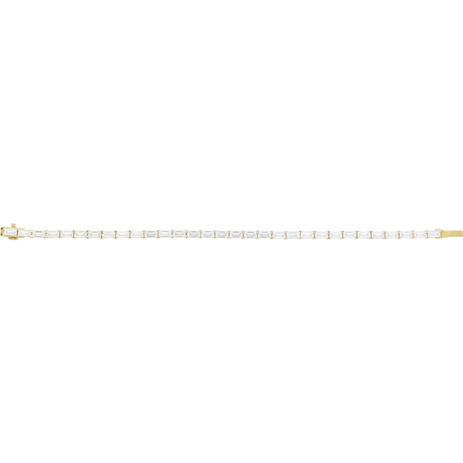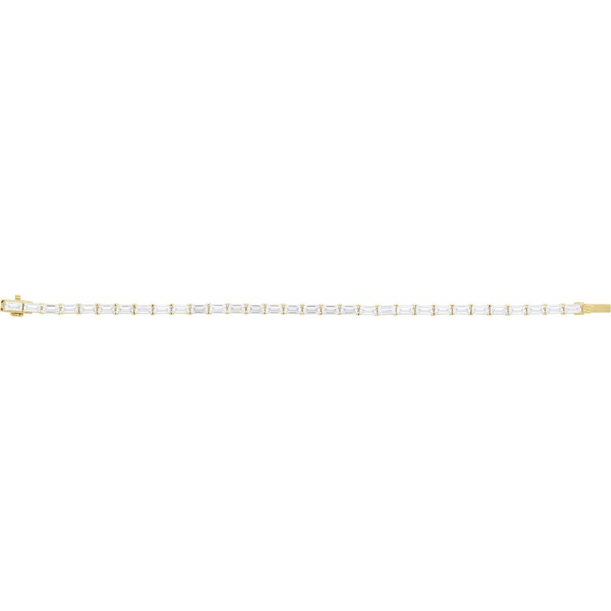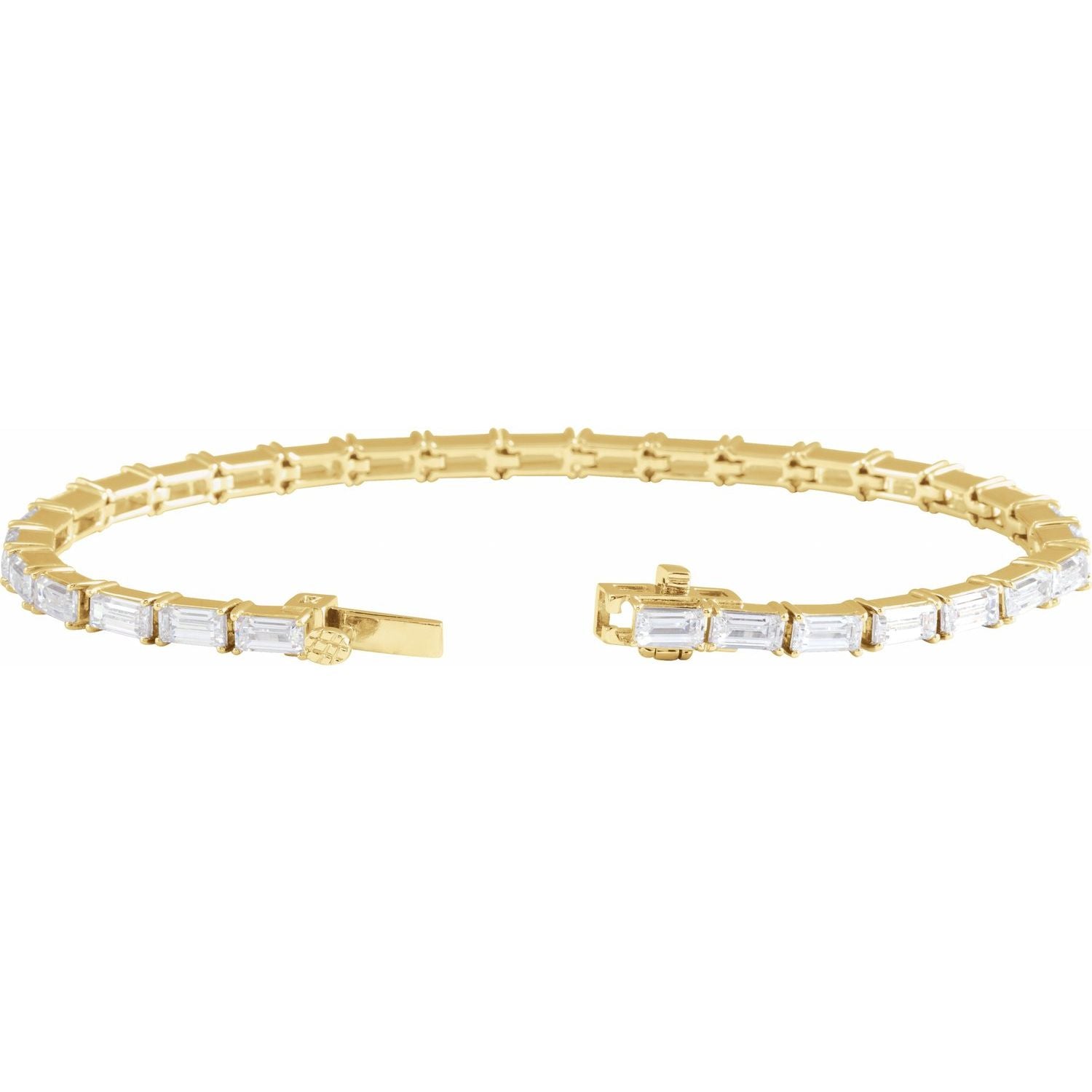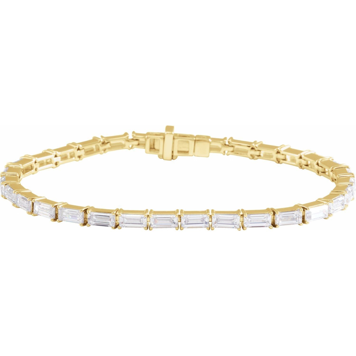 14k yellow gold with 6 1/5 carats of lab-grown diamonds (G-H color, VS clarity). Length: 7 inches. Lobster clasp.