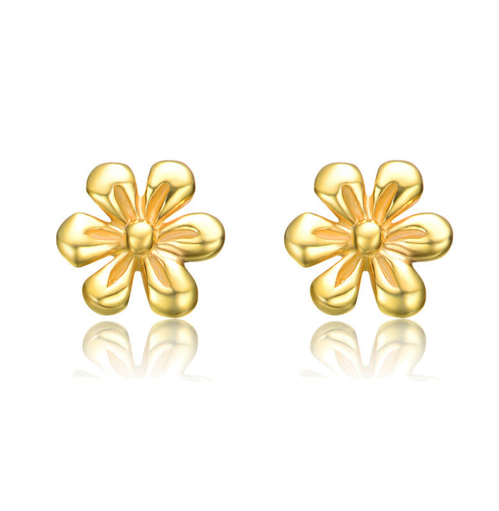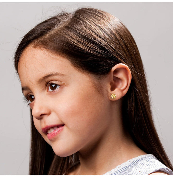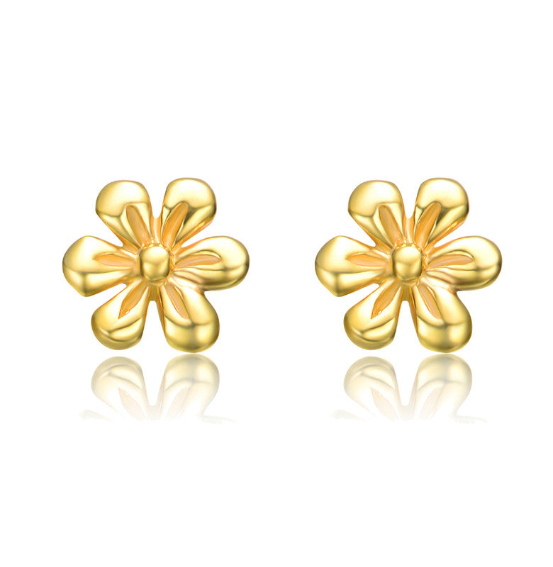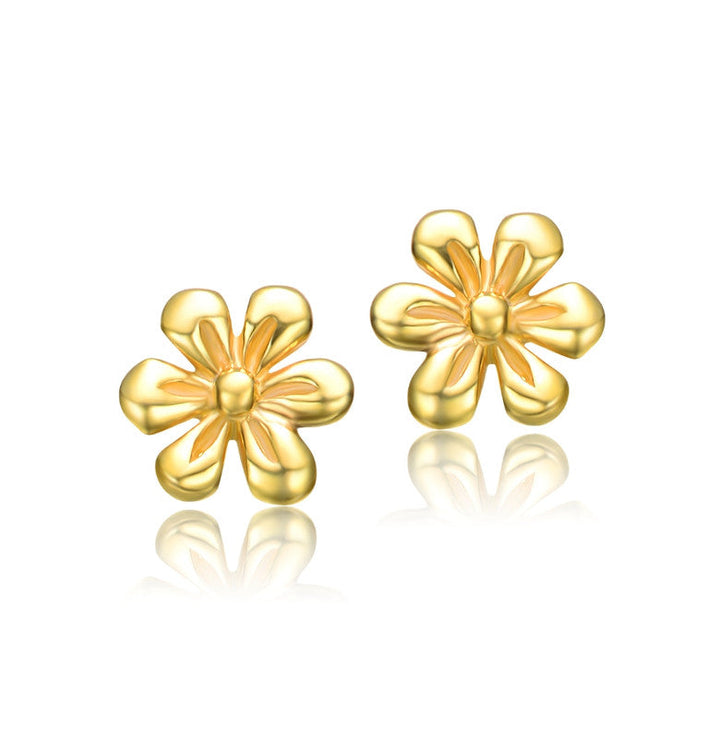 Crafted in sterling silver with 14K gold plating, featuring daisy flower design with detailed petals. The earrings measure 6mm and have a butterfly clasp for secure wear.