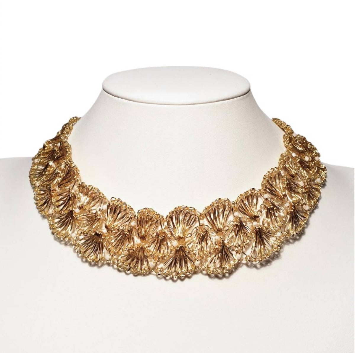 Yellow gold, Crystals, Glass beads, Hand-crocheted wire detailing, Necklace length: 18 inches.