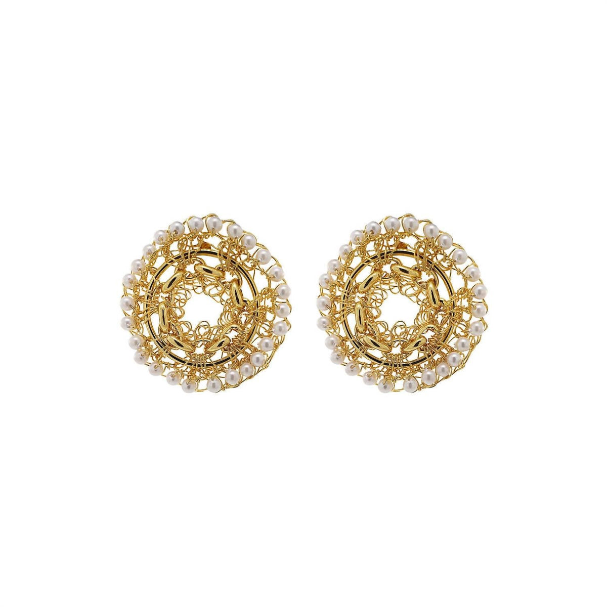 These Women's Medallion Flux Post Earrings in Gold & Pearl by Lavish Alice offer a bold yet sophisticated design. Handmade in Brazil, these earrings feature shiny crystals and are crocheted from 18K gold-filled copper wire. With a blend of gold and pearl, these earrings add elegance and artistry to any occasion.