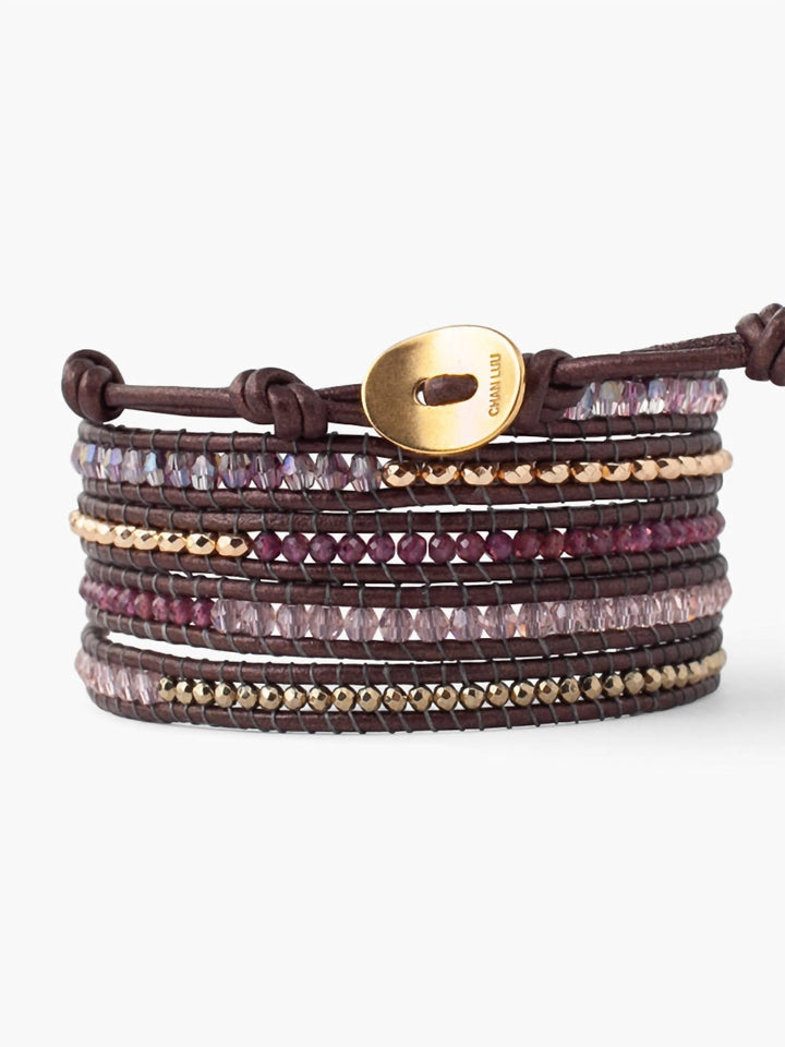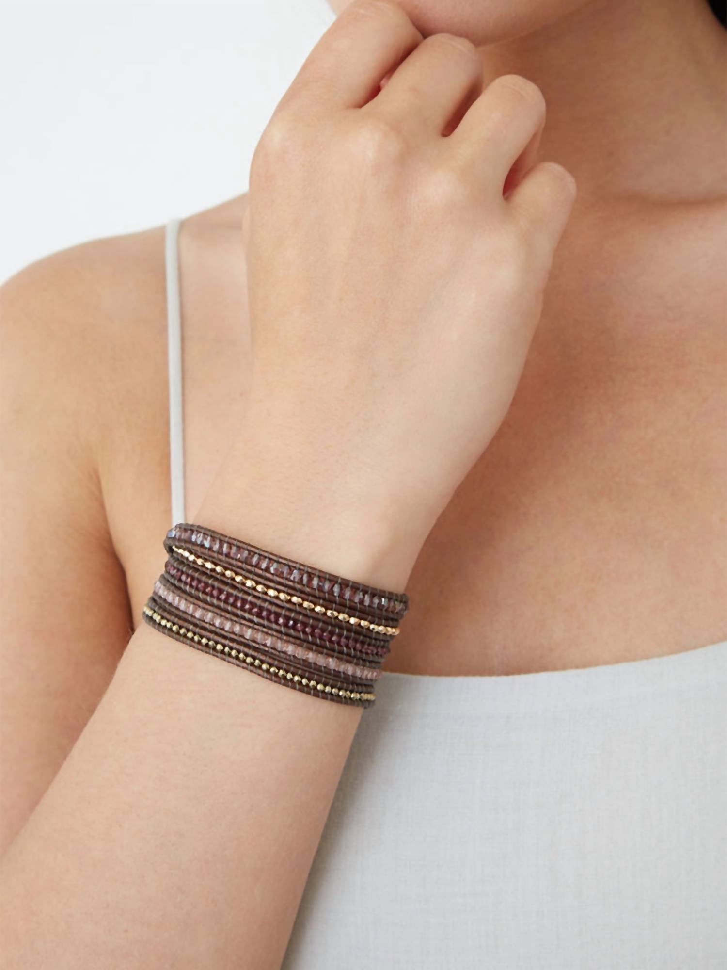 This Women’s Five Wrap Bracelet in Garnet Mix by CHAN LUU is a luxurious accessory that blends the richness of garnet with the elegance of 18k gold-plated sterling silver. Handmade with precision, this bracelet wraps five times around the wrist, offering a striking look. The adjustable length ensures a perfect fit, making it a versatile addition to any jewelry collection.