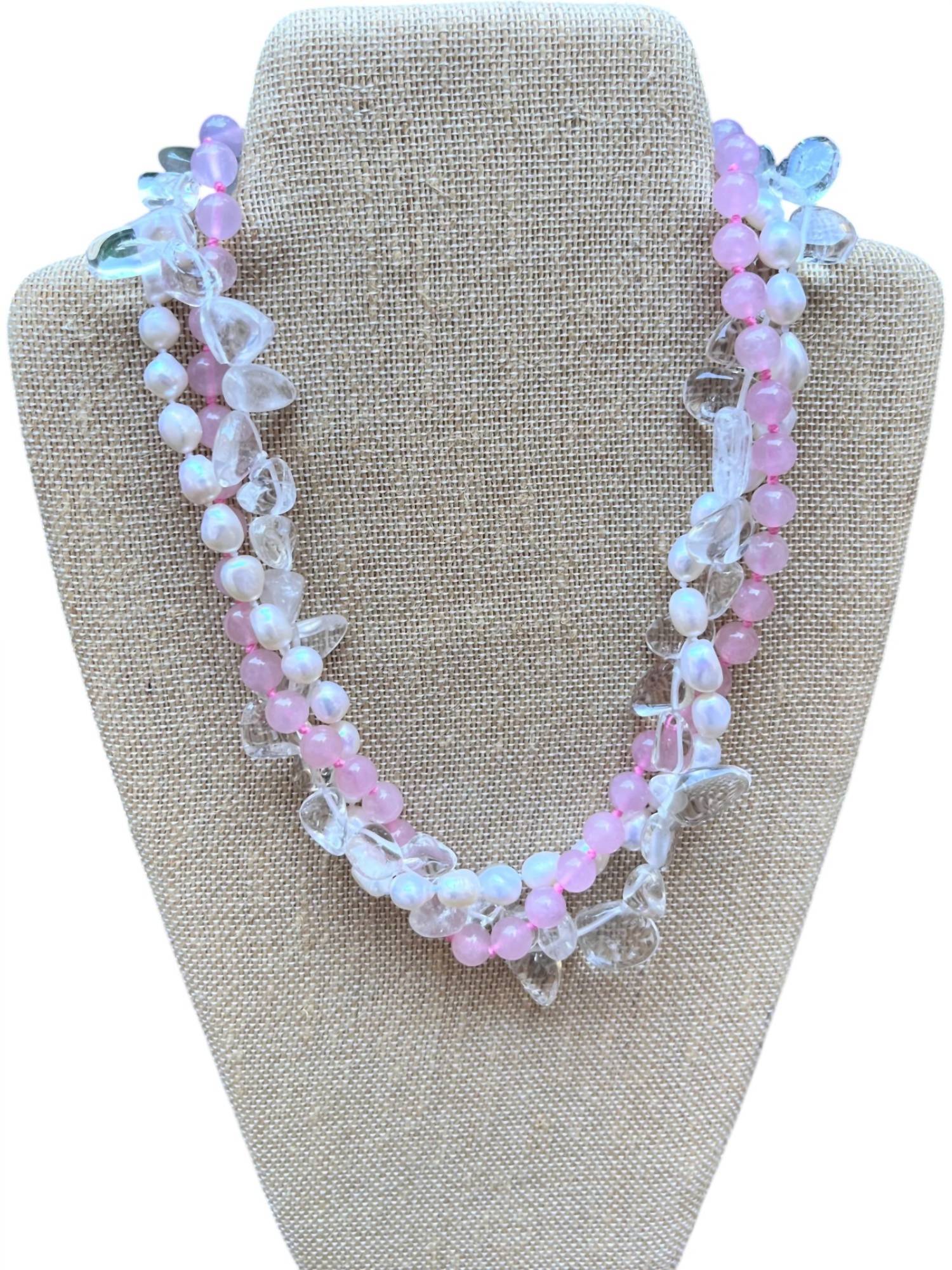 This Women's Stone Twist Necklace in Pink by Studio G is an exquisite piece that blends sophistication with style. With three strands of natural stones and freshwater pearls, this necklace offers a pop of color in a lovely pink hue, making it a versatile piece for any outfit, whether dressed up or down.