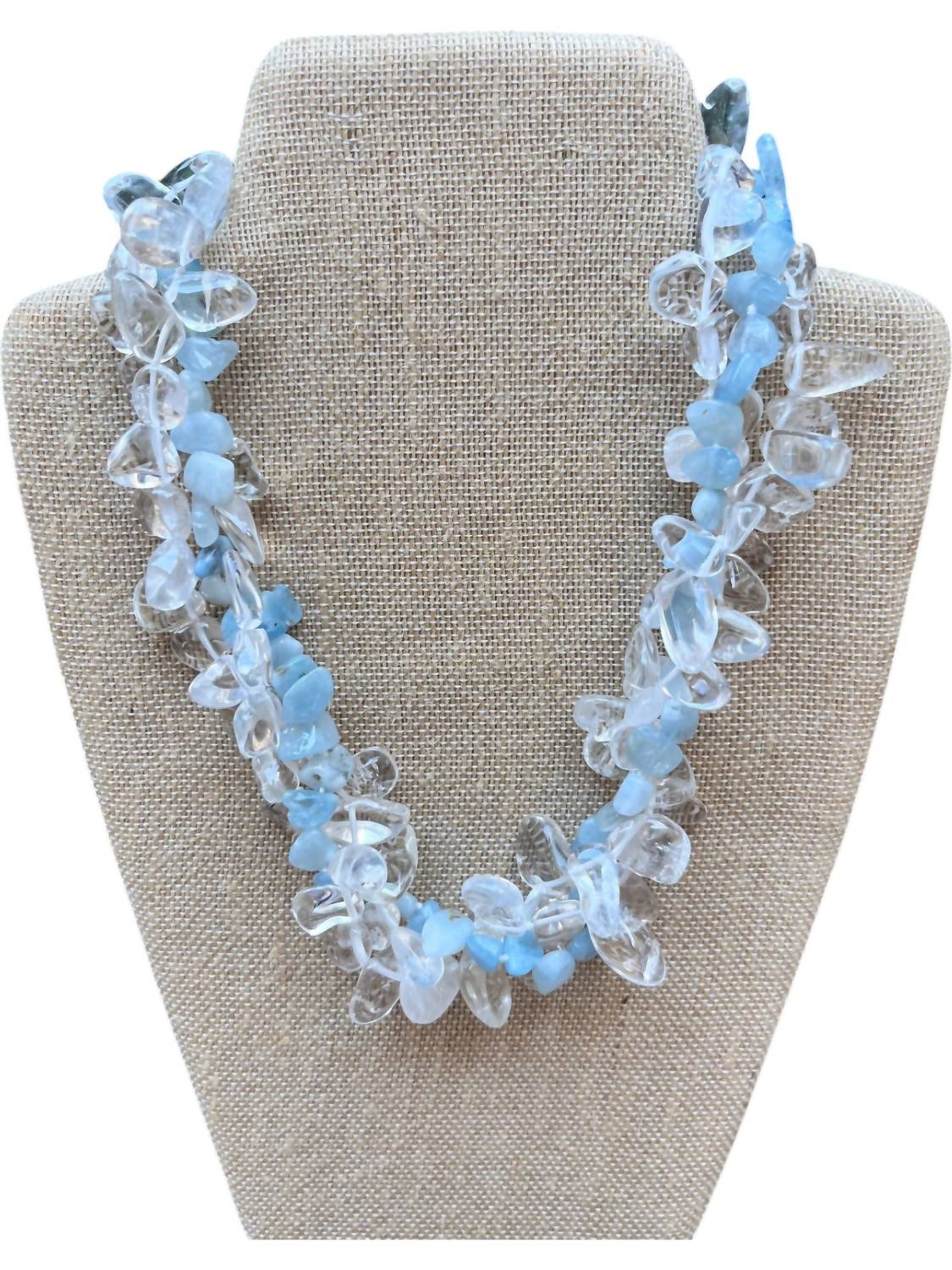This Icy Twist Necklace in Frost Blue by Studio G is a captivating piece that features two clear strands interlaced with a blue larimar strand. Its sophisticated design makes it perfect for both casual and formal occasions.