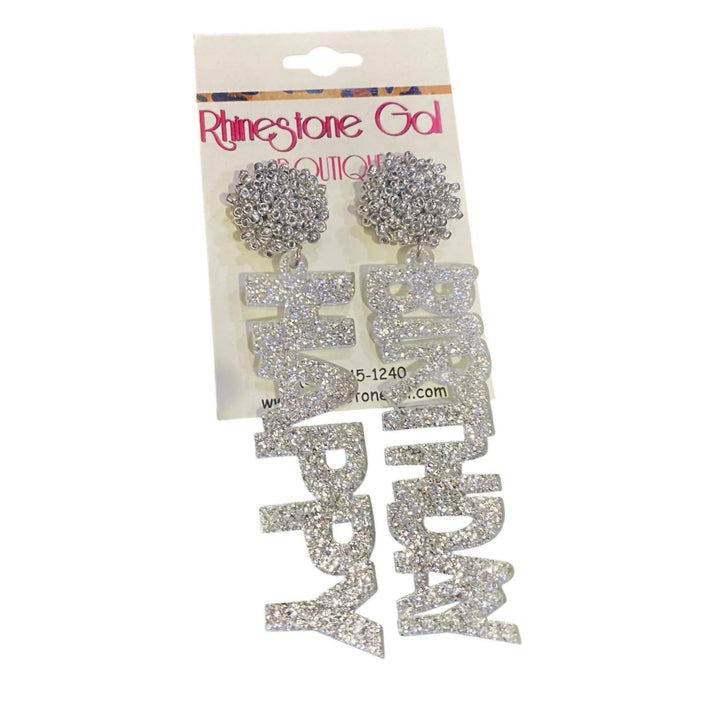 These Celebrate Your Day in Sparkle Earrings in Silver by SW Trading are perfect for adding a bit of fun to your outfit. The acrylic 'Happy Birthday' lettering dangle from the earrings, offering bold and playful charm. These earrings are ideal for celebrating special occasions in style.