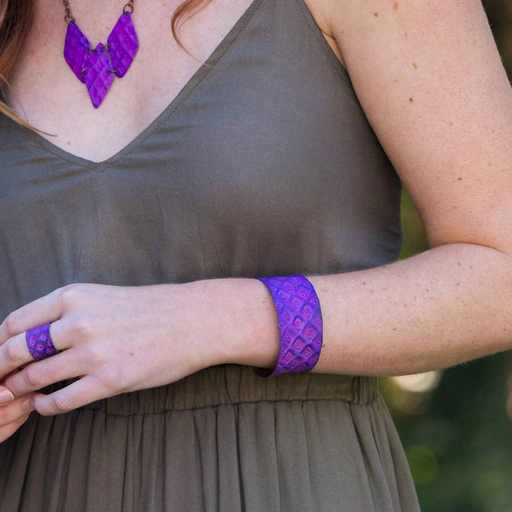 This Women’s Geo Copper Necklace in Purple by Anju is handcrafted with a diamond-shaped design and a stunning copper patina finish. It adds a bold and artisanal touch to any outfit, making it perfect for those who want something unique and statement-making.