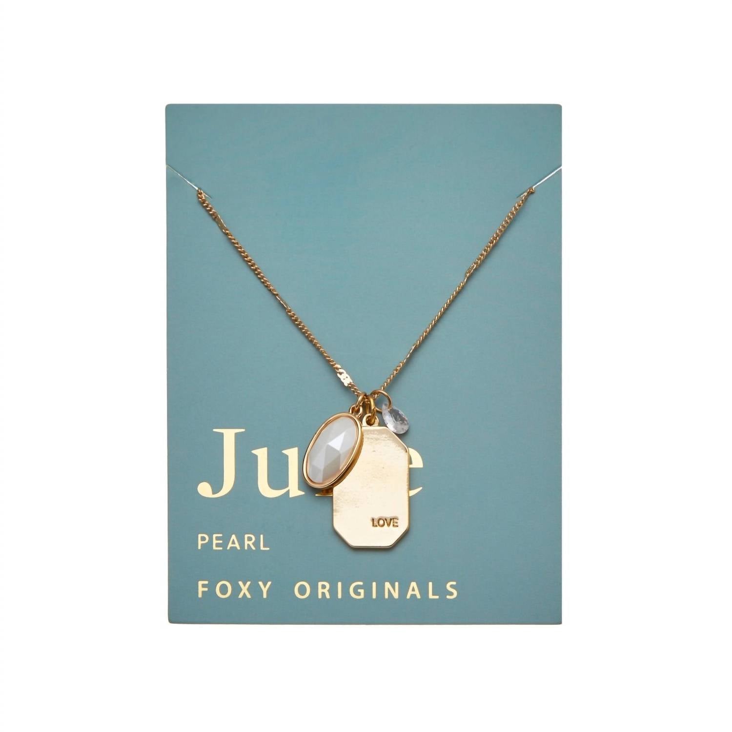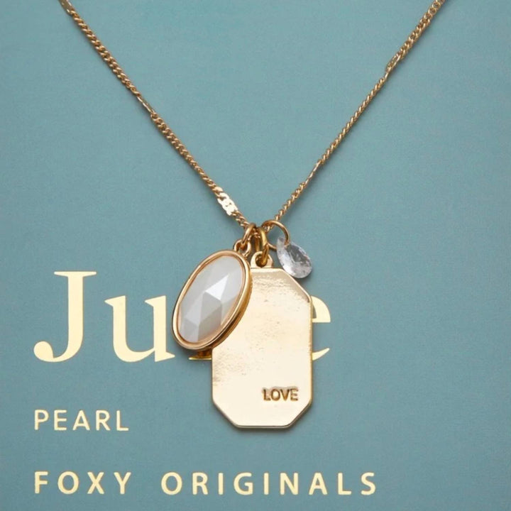 This Women's Birthstone Charm Necklace by Foxy Originals in June features an oval pearl birthstone paired with a rhinestone and an inspirational dog tag. The piece is made from lead-free fine pewter, plated in luxurious 14 karat gold, and is a thoughtful and stylish gift for June birthdays.