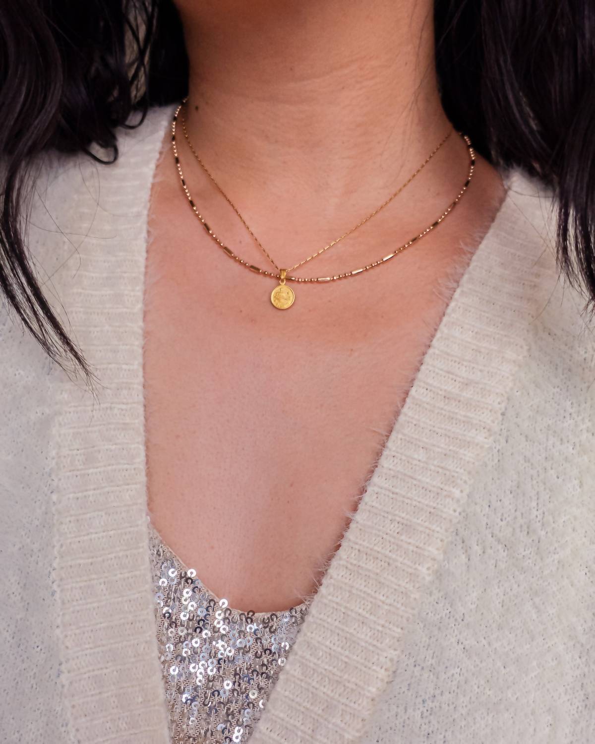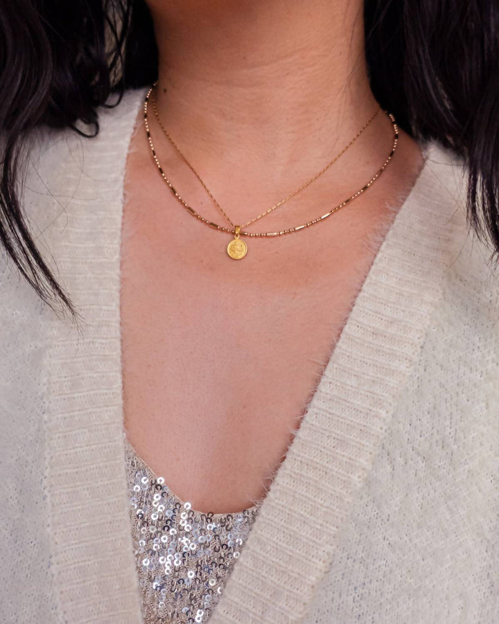 14K gold over brass, 1 cm medallion, adjustable 16” + 2” chain.