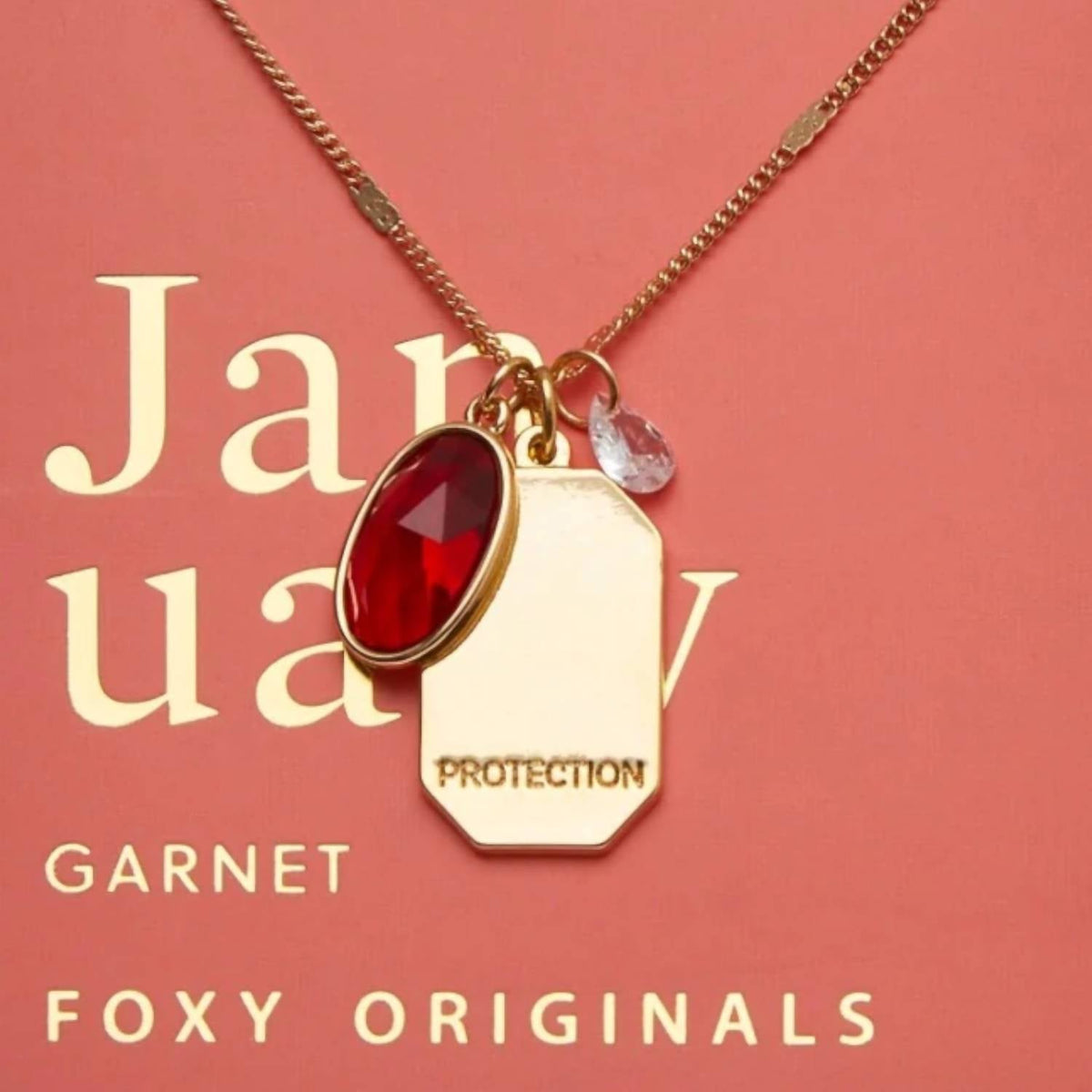 This Women's Birthstone Charm Necklace in January by Foxy Originals is an elegant and personal piece, perfect for celebrating individuality. Featuring a striking oval January birthstone charm, rhinestone, and inspirational dog tag, this necklace is made of fine pewter plated in 14kt gold. Produced locally in Toronto, it offers a delicate yet meaningful statement, perfect for layering or wearing solo.