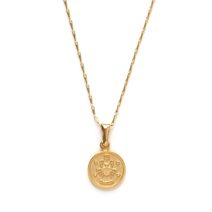This Zodiac Medallion Charm Necklace in Cancer by Amano Studios is an elegant piece featuring a 1 cm Cancer zodiac medallion, crafted in 14K gold over brass. It’s a meaningful addition for those who cherish astrology and unique jewelry designs.