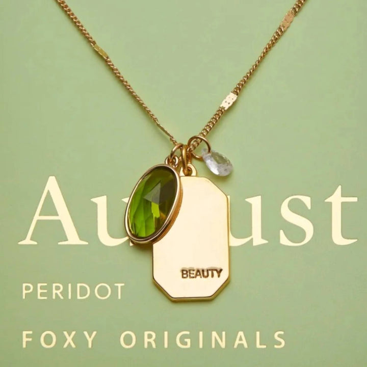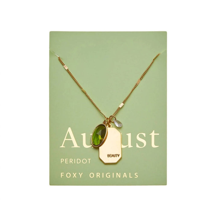 This Women's Birthstone Charm Necklace in August by Foxy Originals is a standout piece that combines elegance with meaningful symbolism. Featuring an oval August birthstone charm, this necklace is paired with a rhinestone and an inspirational dog tag. Crafted in high-quality, lead-free fine pewter and plated in 14kt gold, it reflects the brand's commitment to sustainable, high-quality jewelry. Locally produced in Toronto, this necklace is perfect for adding a personalized touch to any outfit.