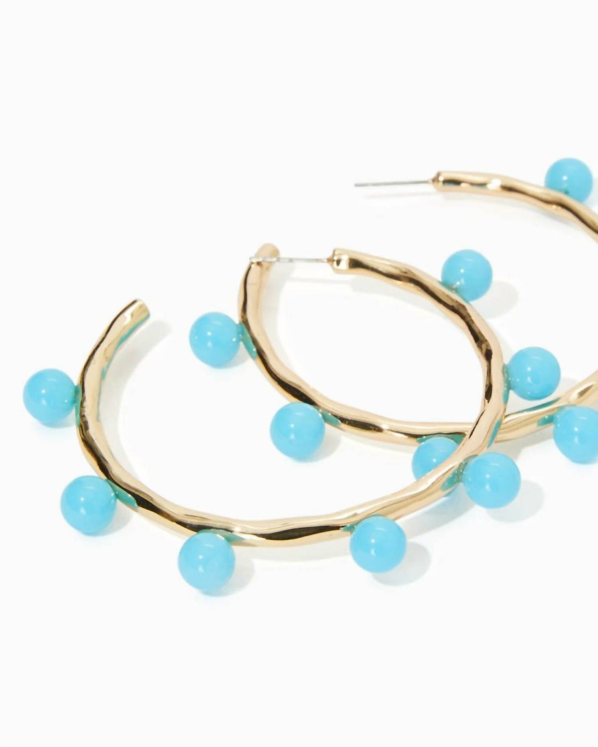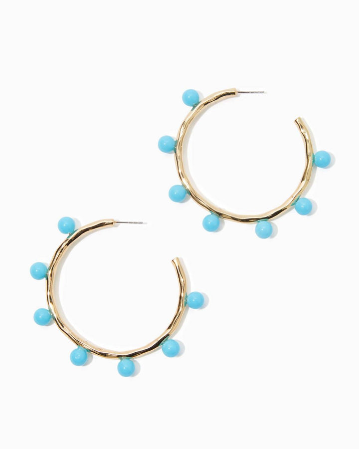 These Women's Wave N Sea Hoop Earrings in Blue by Lilly Pulitzer: Add a splash of oceanic color to your look with these textured gold hoops adorned with striking turquoise beads. These earrings measure 2' in diameter and are perfect for a beachy, yet chic, style.