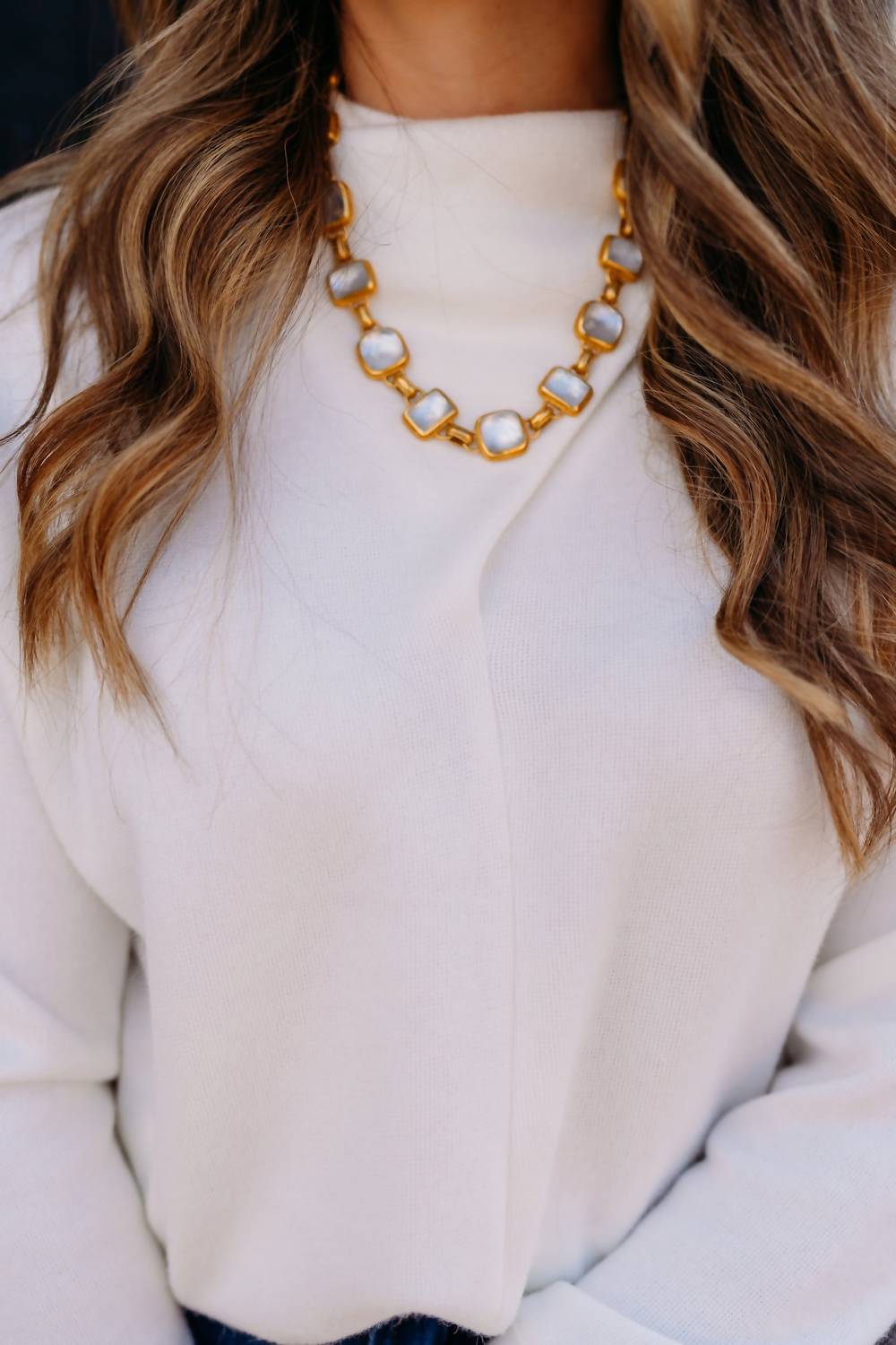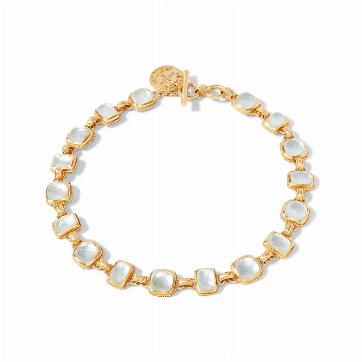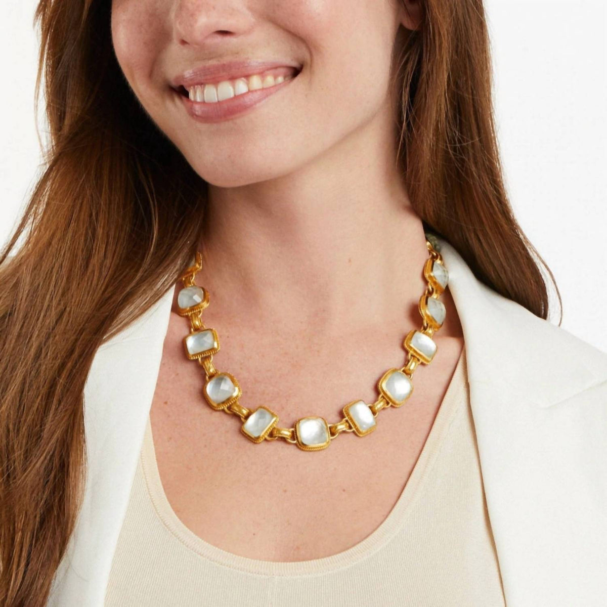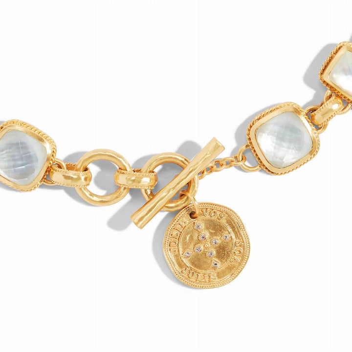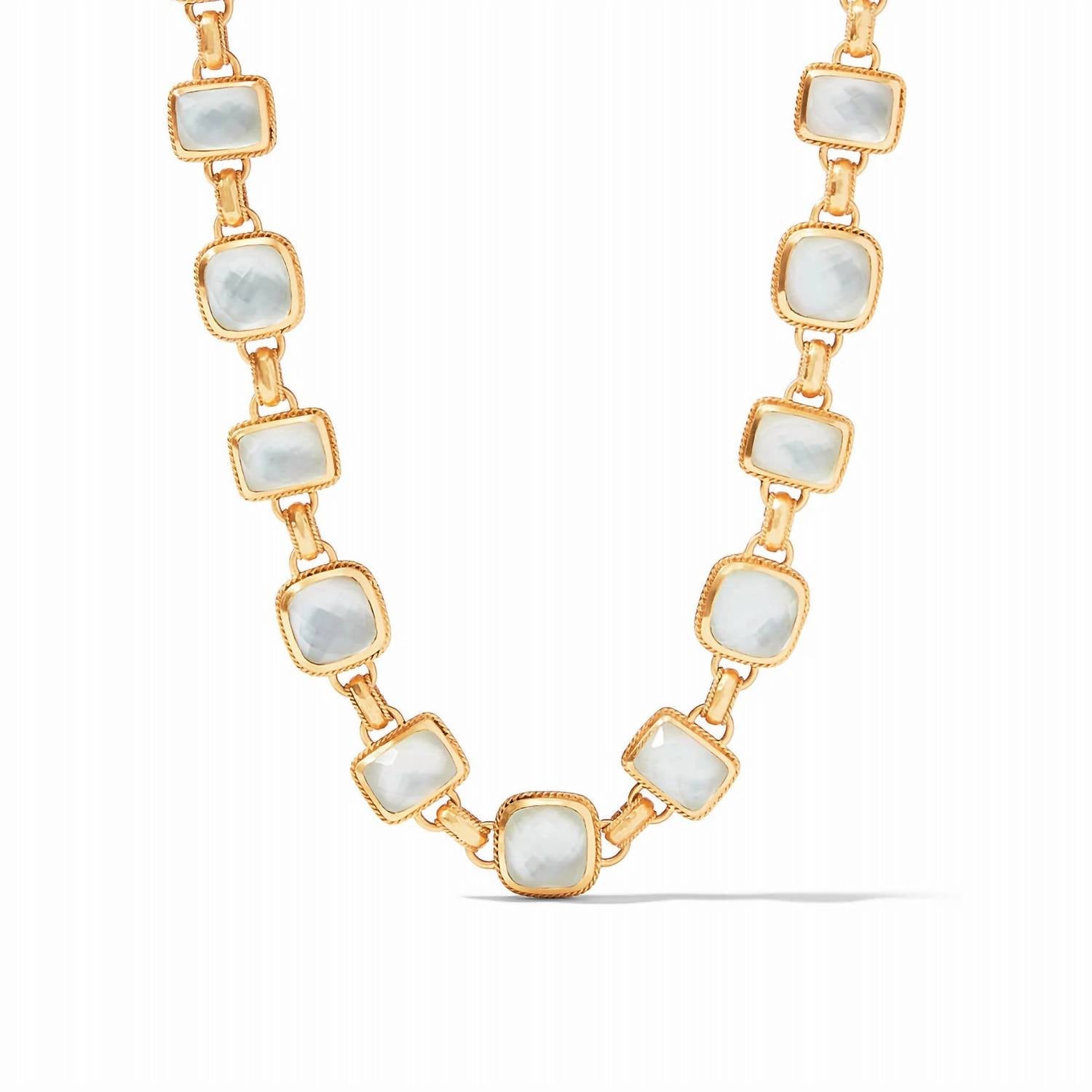 This Savoy Statement Necklace in Gold by Julie Vos features rose-cut iridescent clear crystal gemstones set in 24K gold plate. With adjustable sizing, this necklace is a show-stopping piece for any occasion.