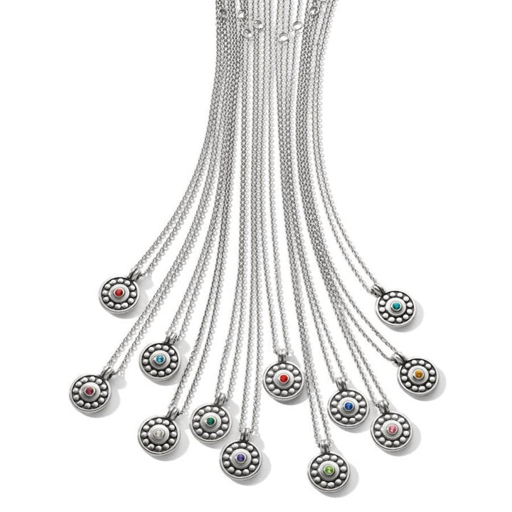 This Women's Pebble Dot Medali Petite Reversible Necklace in July-Light Siam by Brighton is a versatile and eye-catching piece. The Bali-inspired design features fine quality crystals in a striking silver-plated finish, allowing the necklace to be worn in multiple ways. Whether worn solo or layered, this necklace offers a pop of color and charm for any occasion.