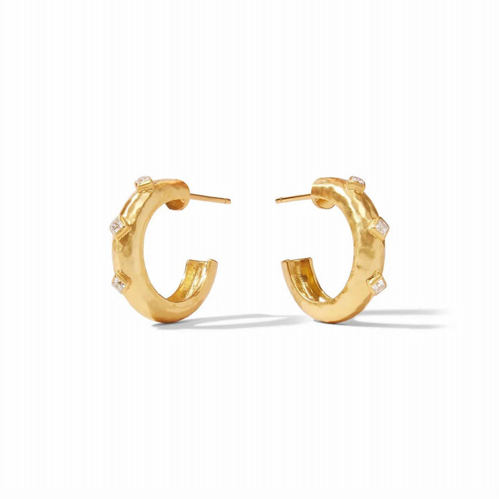 These Noel Stone Hoop Earrings in Gold by Julie Vos feature brilliant-cut CZ stones set in a diamond-shaped design. The lightly hammered texture adds an artistic flair, and the three size options—small, medium, and large—allow you to choose the perfect fit for any occasion. Plated in 24K gold, these earrings bring a modern twist to classic hoop designs, making them perfect for both everyday wear and special events.