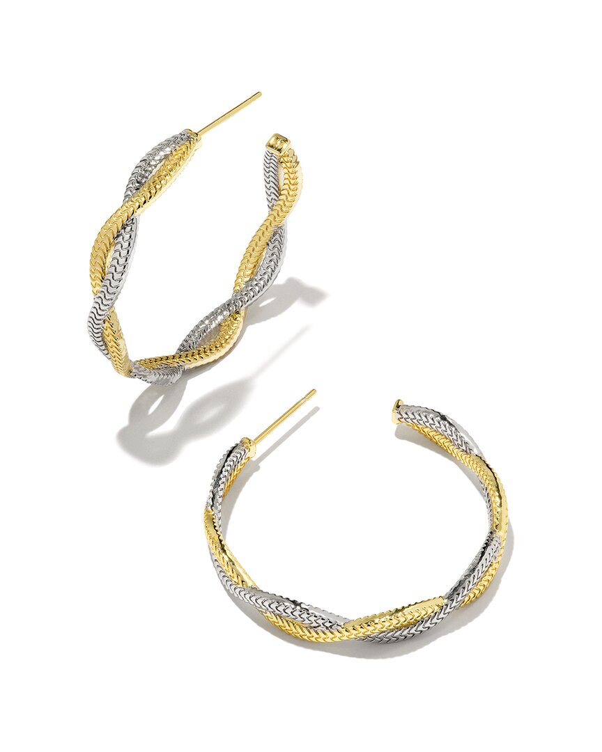 These Kendra Scott Hayden 14K Plated Hoops are a chic and stylish accessory that enhances any look. Known for their playful and trendy designs, these hoops are crafted from 14K gold and rhodium over brass. The 1.4-inch drop length provides an elegant yet bold statement, making them perfect for both casual and formal occasions.