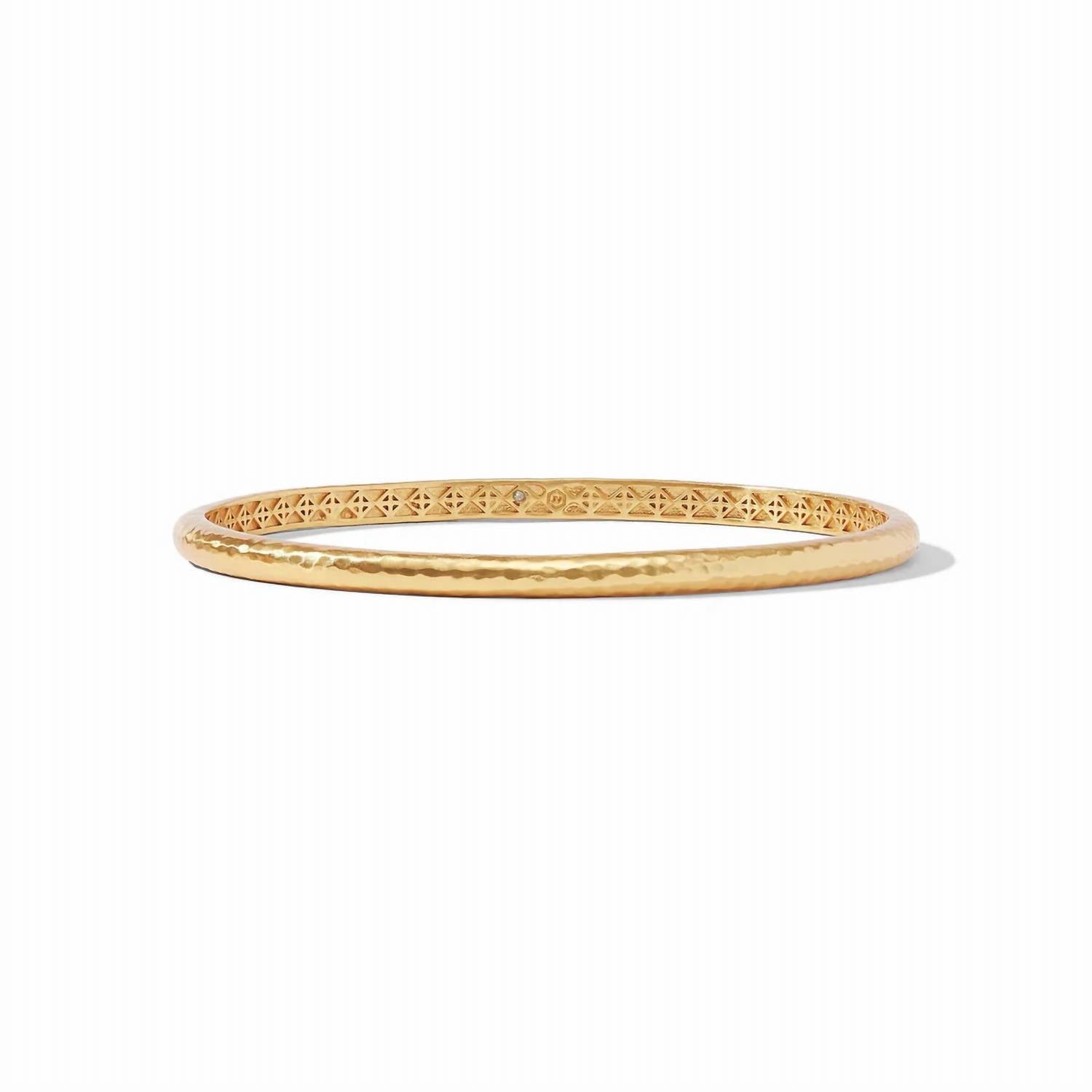 This Havana Demi Bangle in Gold by Julie Vos is a slim, hand-hammered bangle that combines luxury with a delicate geometric bas relief interior. Available in small, medium, and large sizes, this 24K gold-plated bangle is an essential accessory for any jewelry collection. Wear it solo for a subtle statement or stacked for added impact.