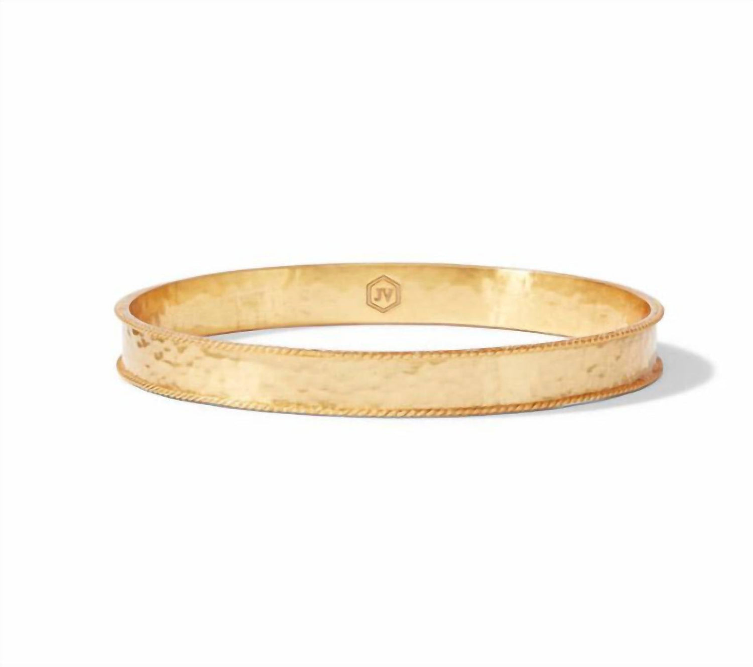 This Savoy Bangle in Gold by Julie Vos is an eye-catching 24K gold-plated bangle with a hammered finish and twisted wire detail. The signature Julie Vos hallmark ensures authenticity, making it a luxurious and timeless addition to your collection. Whether worn on its own or stacked with other pieces, this bangle exudes sophistication.