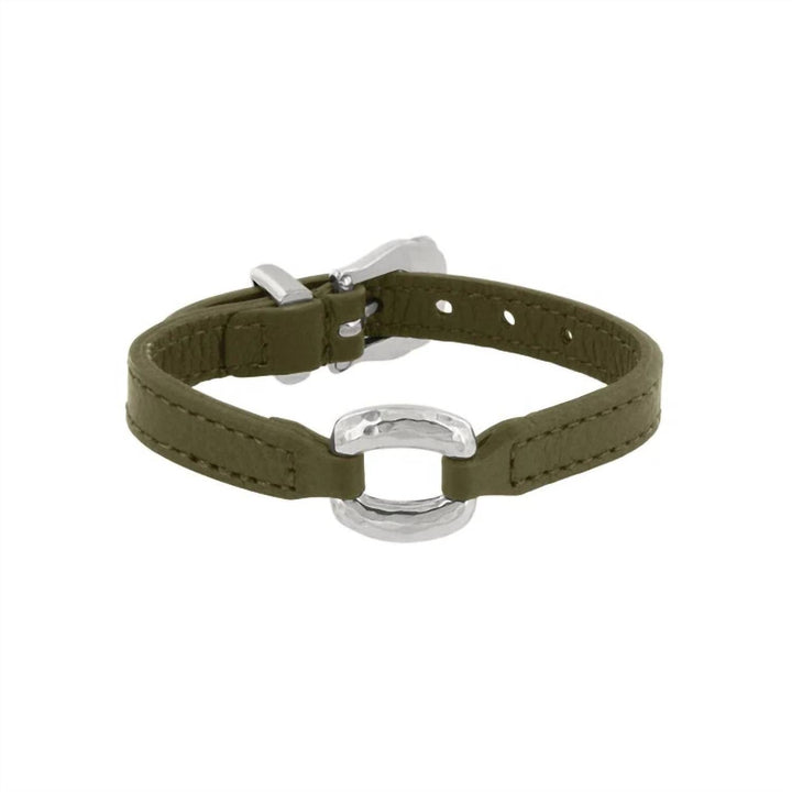 This Women's Timeless Link Bandit Bracelet in Olive by Brighton is crafted from exquisite Italian leather with a hand-hammered link ornament at the center, adding sophistication and luxury. The silver-plated finish ensures a lustrous shine, while the buckle closure allows for easy wear and a secure fit.