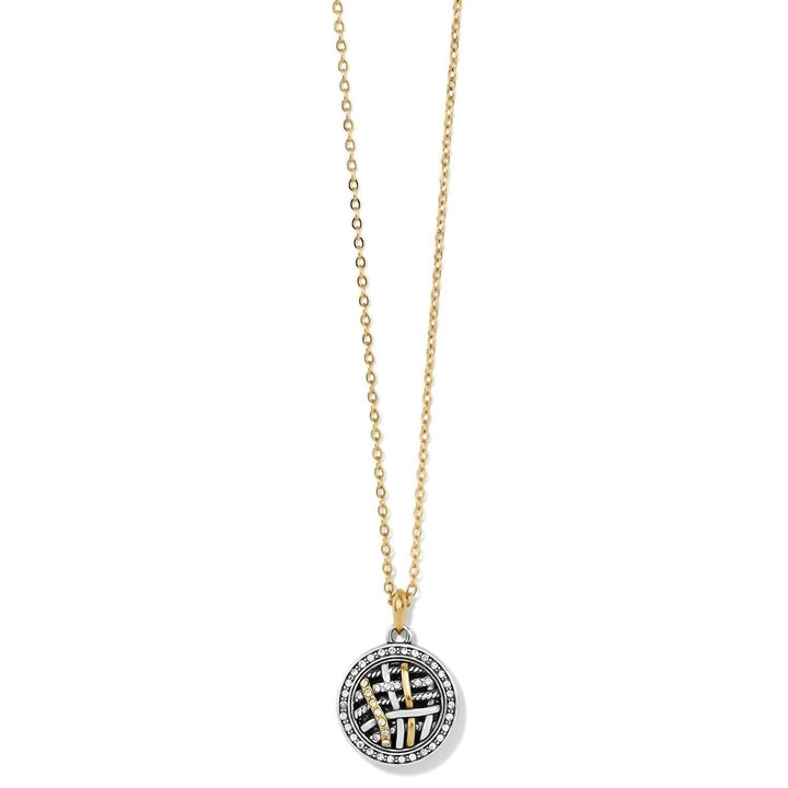This Women's Neptune's Rings Woven Petite Necklace in Gold-Silver by Brighton is a delicate and versatile piece. It features a pillow-shaped 'woven' pendant adorned with fine crystals, perfect for both everyday wear and special occasions. The adjustable length ensures a perfect fit for any neckline.
