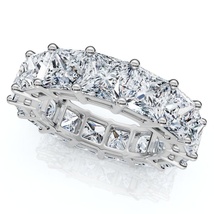 Crafted in 14K White Gold, this eternity ring features lab-grown princess square brilliant cut diamonds with a total carat weight of 8ct. The diamonds are VS clarity and F-G color. The ring measures 4.5mm in width and is finished with a high-polish for a sleek, reflective look. Available in size selectable options.