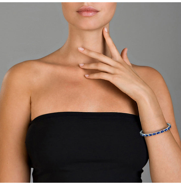 This White Gold Plated with Colored Cubic Zirconia Tennis Bracelet by Rachel Glauber offers a dazzling combination of vibrant cubic zirconia stones. Choose from Emerald Green or Sapphire Blue hues, each stone meticulously set in a sleek, polished white gold-plated finish. Perfect for adding a touch of glamour to any outfit, this bracelet is secured with a box clasp, ensuring a comfortable and secure fit for both formal events or everyday wear.