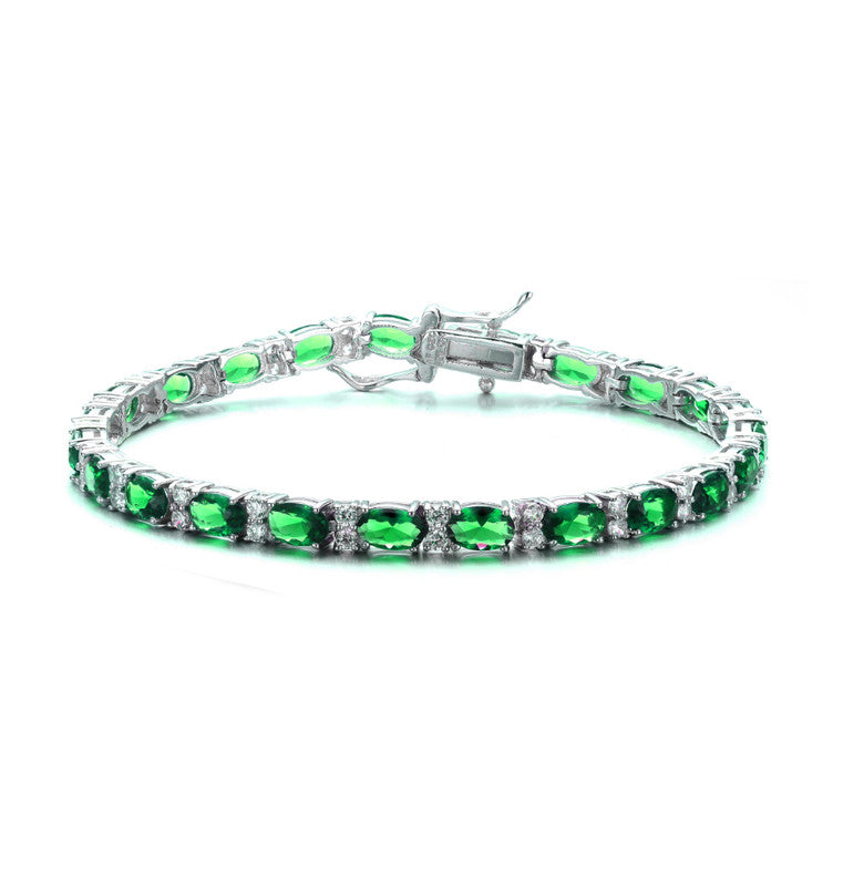 White gold-plated finish with cubic zirconia stones in emerald green or sapphire blue. Box clasp closure.