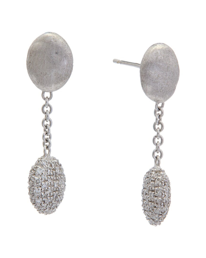 Crafted from 18K white gold, featuring 0.93 ct. total weight of pave-set diamonds. Drop length: approximately 1.15 inches. Post back for secure wear.