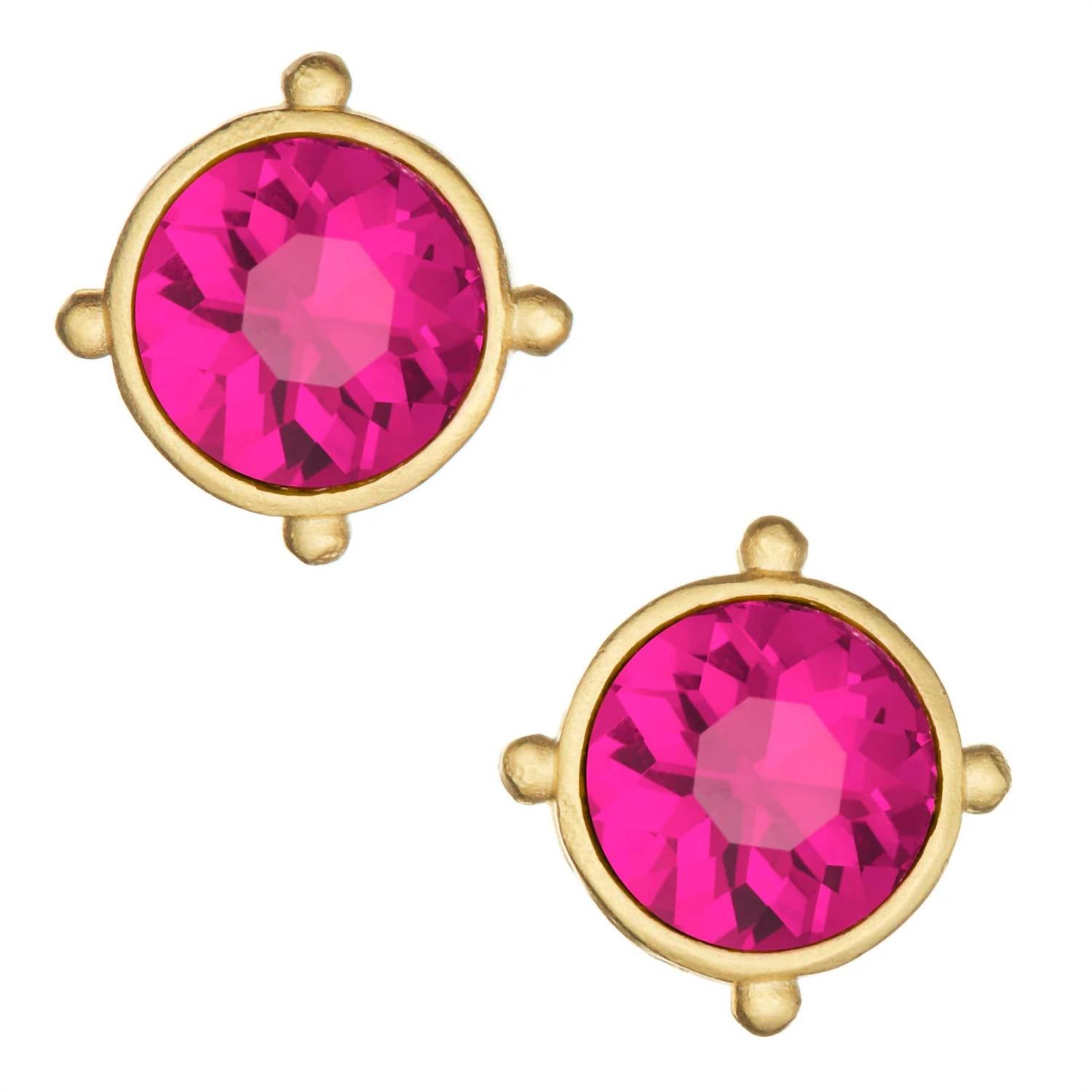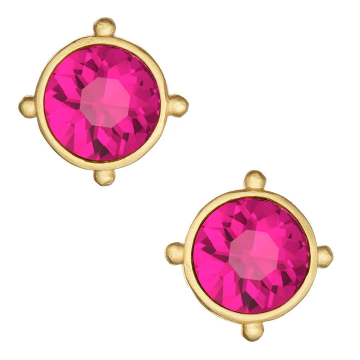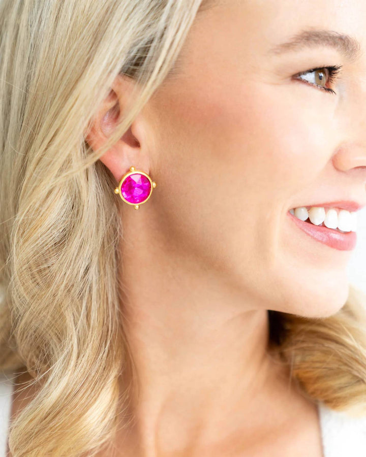 These Women's Coupe Stud Earrings in Viva Magenta by Susan Shaw: Handmade with love in San Antonio, Texas, these earrings boast a vibrant Viva Magenta hue set in triple-plated 24k gold. The stunning gemstones add a sparkle that complements any outfit, while the post back closure ensures a secure fit.