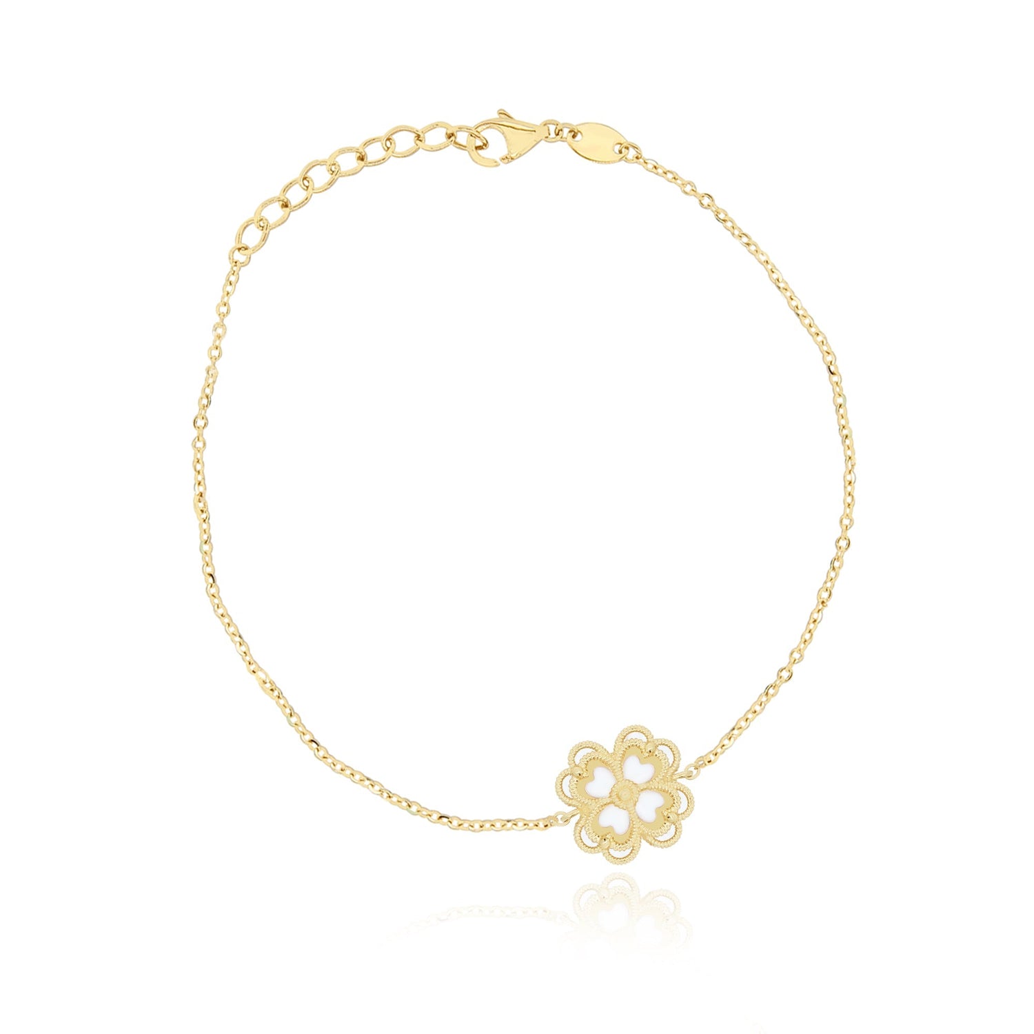 Handcrafted in 14k yellow gold, featuring a 13mm clover, adjustable chain length from 6.25 to 7 inches, with a lobster clasp.
