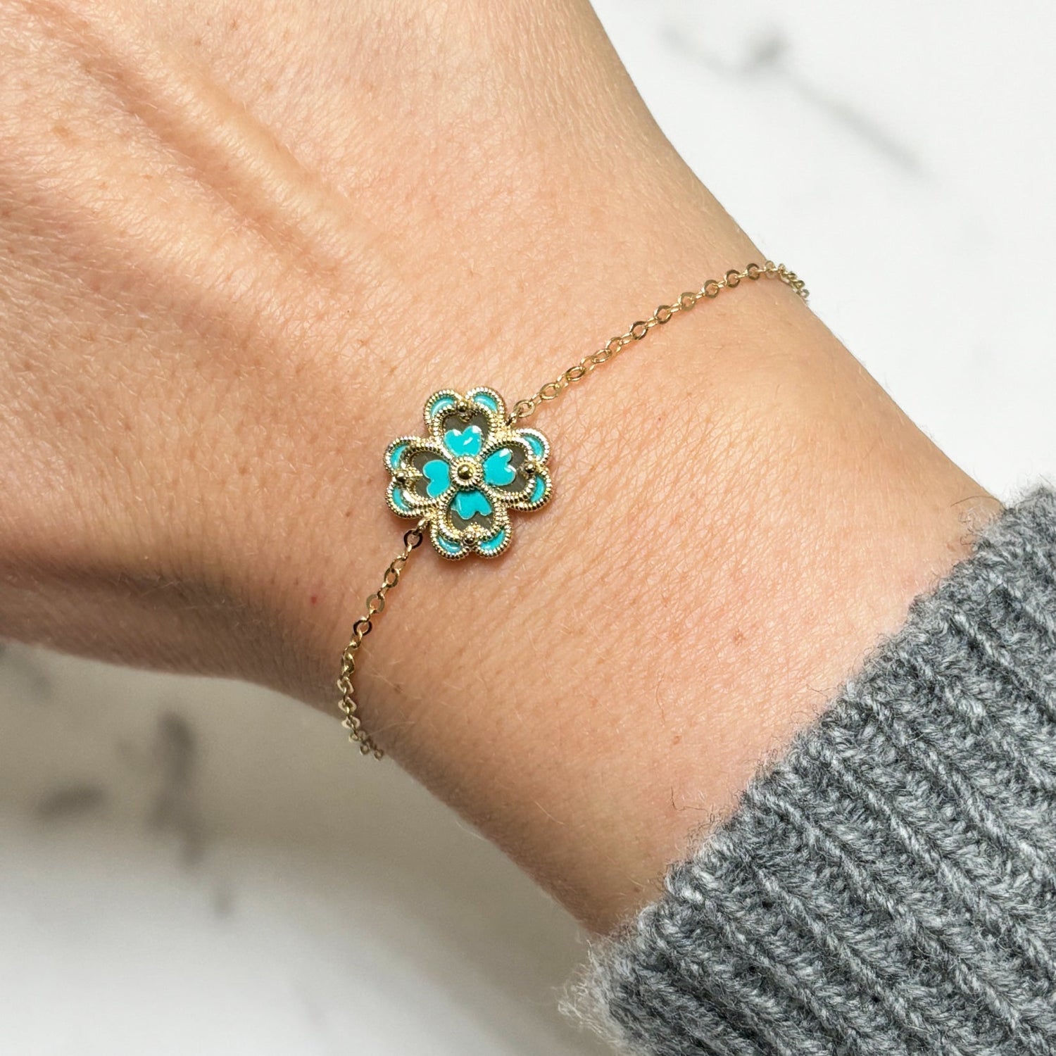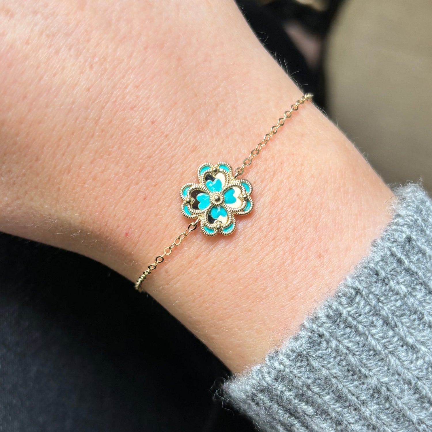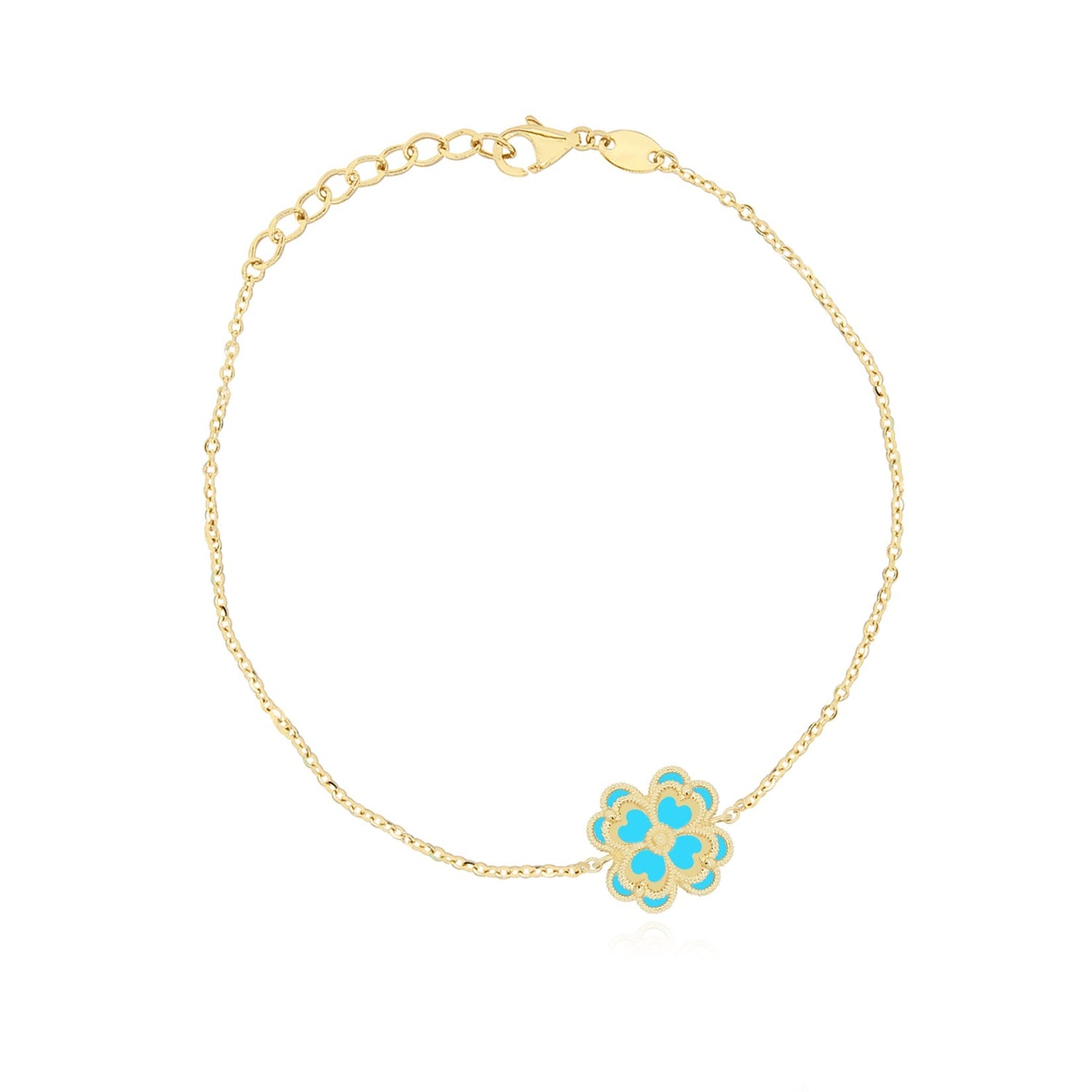 Handcrafted in 14k yellow gold, featuring a 13mm blue enamel clover, adjustable chain length from 6.5 to 7 inches, with a lobster clasp.