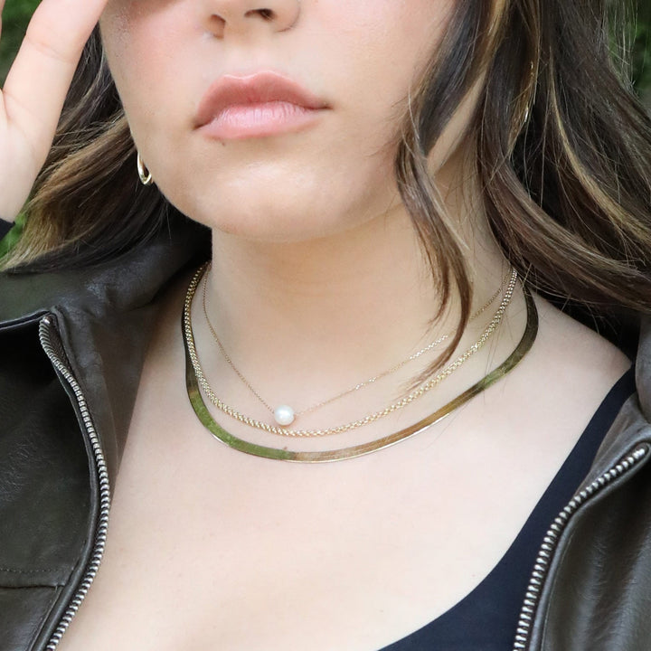 This Single Pearl Necklace by The Lovery is a timeless classic, perfect for any occasion. The lustrous pearl set in 14K gold offers a simple yet sophisticated look, ideal for layering or wearing alone.