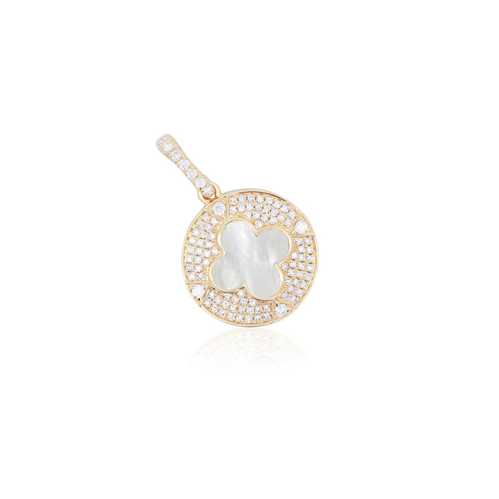 14K yellow gold. Mother of pearl clover charm measures 15mm. Clover measures 9mm. Round brilliant white diamonds at 0.28 carats total weight. H-I color, SI clarity. Diamond bale opens to clasp onto a link chain.