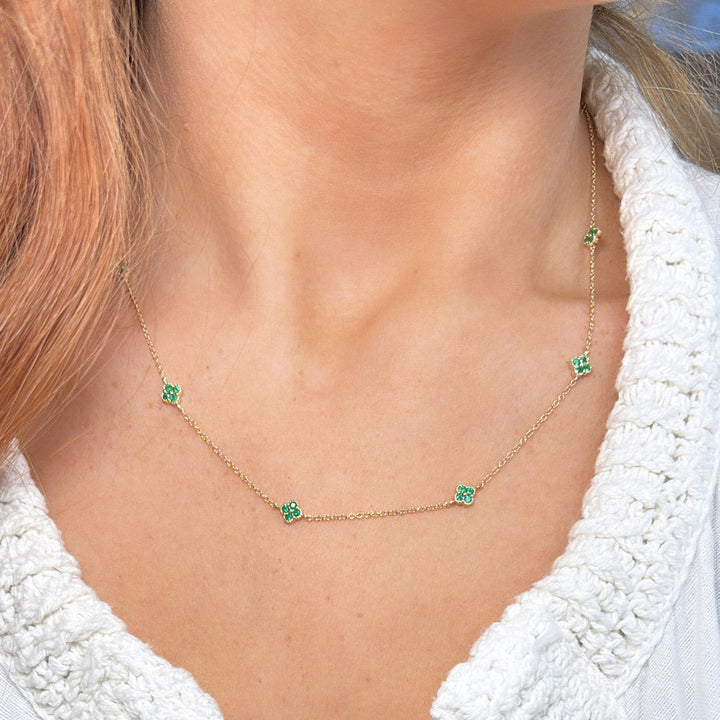 This Emerald Clover Station Necklace by The Lovery features seven emerald clovers, each measuring 5mm, and set in 14K yellow gold. The 28 round emeralds, totaling 0.51 carats, make this piece a symbol of both beauty and good fortune. A perfect necklace for any occasion.