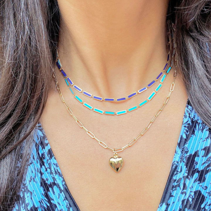 The Turquoise Bar Necklace 18 Inches by The Lovery is a stunning and simple piece, ideal for layering or as a solo accessory. The turquoise bars add a fresh, natural touch.